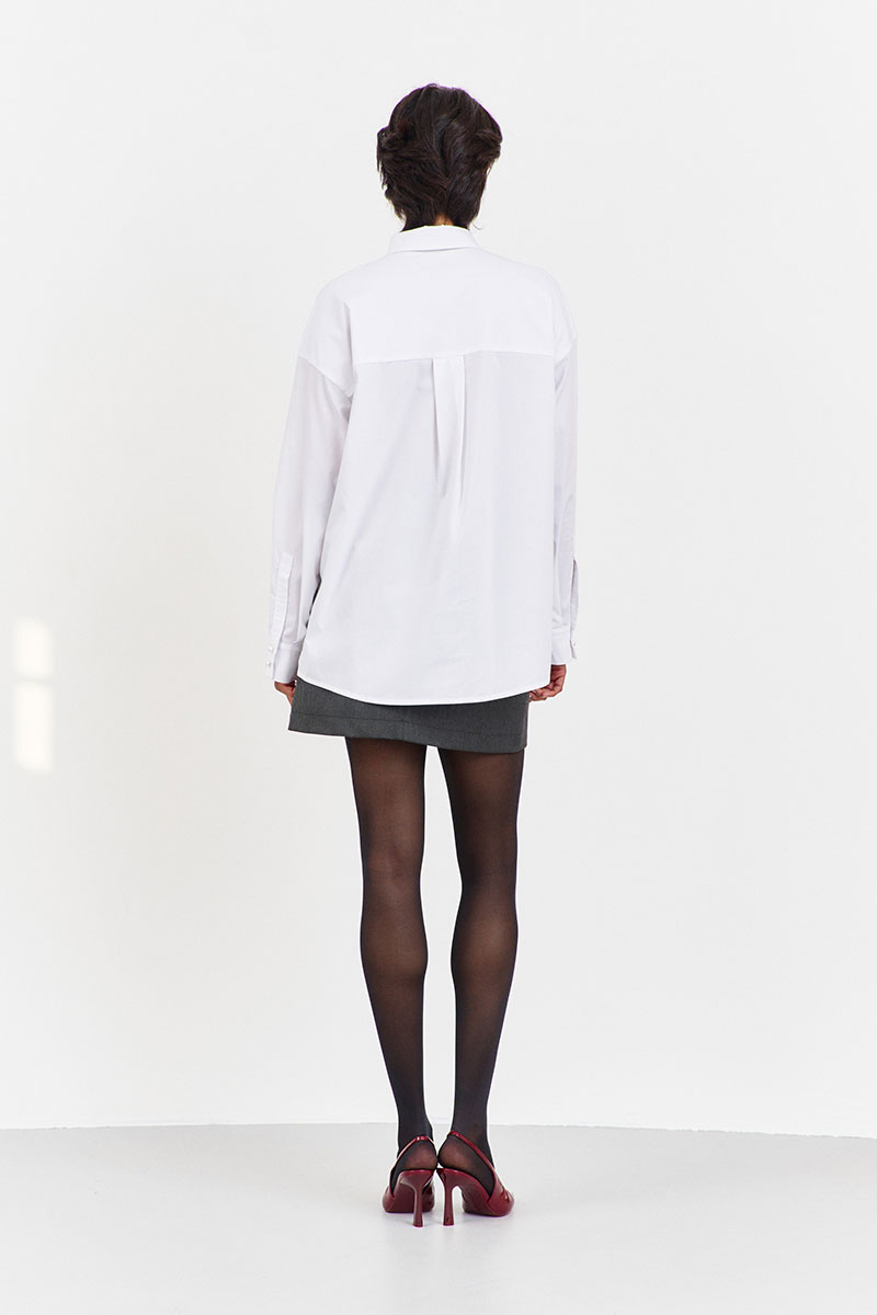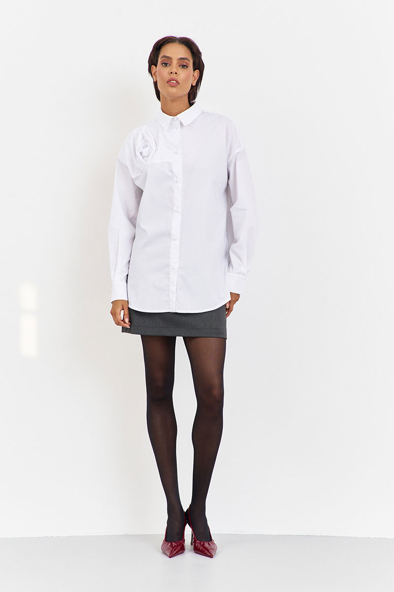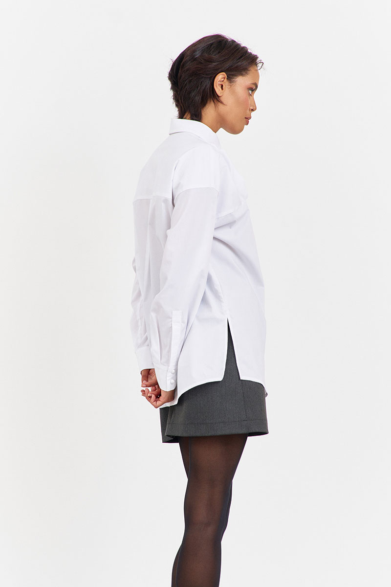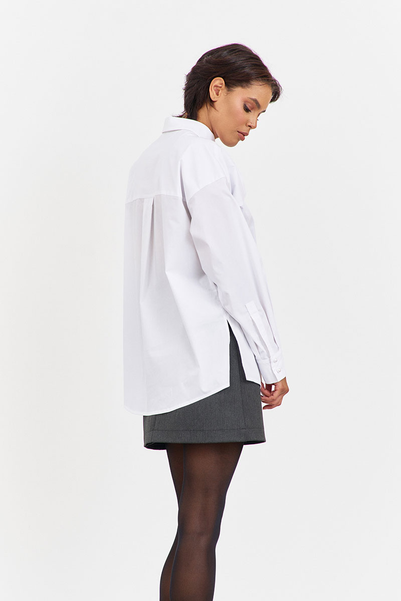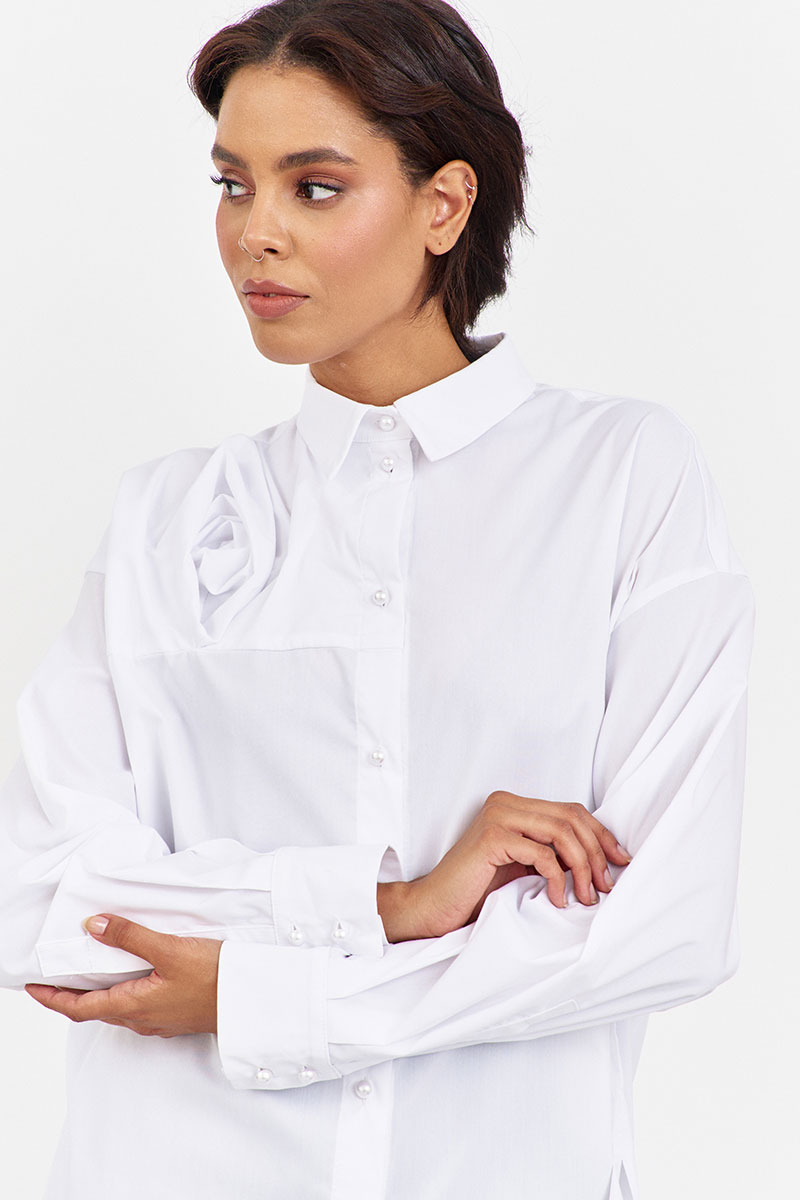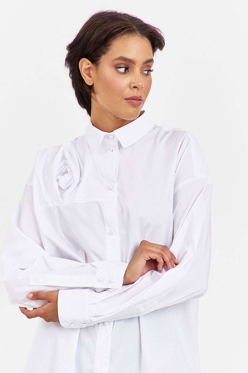 Блузка с декоративной кокеткой по переду в белом цвете. Характеристики: свободный силуэт, выполнена из рубашечной ткани, центральная застежка на петли и пуговицы, по спинке отрезная кокетка и складка, низ рукава обработан манжетой на петли и пуговицы.