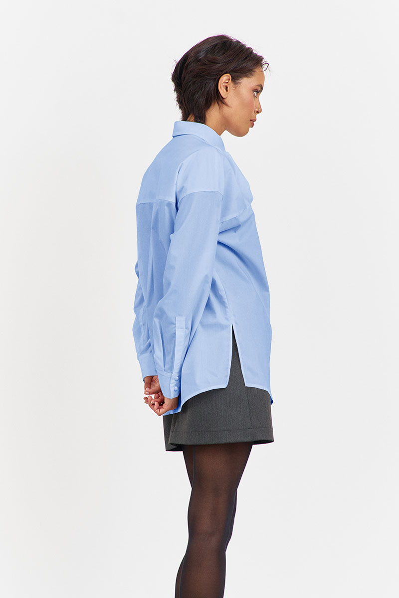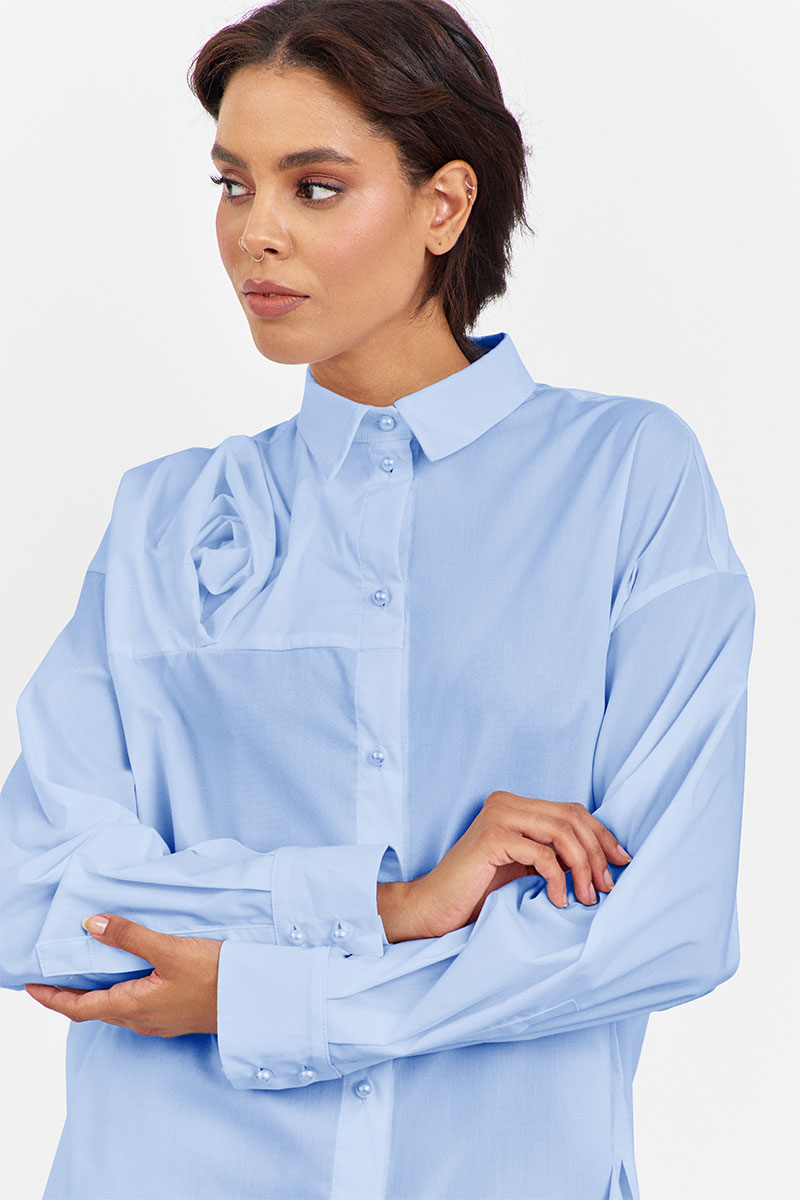 Блузка с декоративной кокеткой по переду в голубом цвете. Характеристики: свободный силуэт, выполнена из рубашечной ткани, центральная застежка на петли и пуговицы, по спинке отрезная кокетка и складка, низ рукава обработан манжетой на петли и пуговицы.