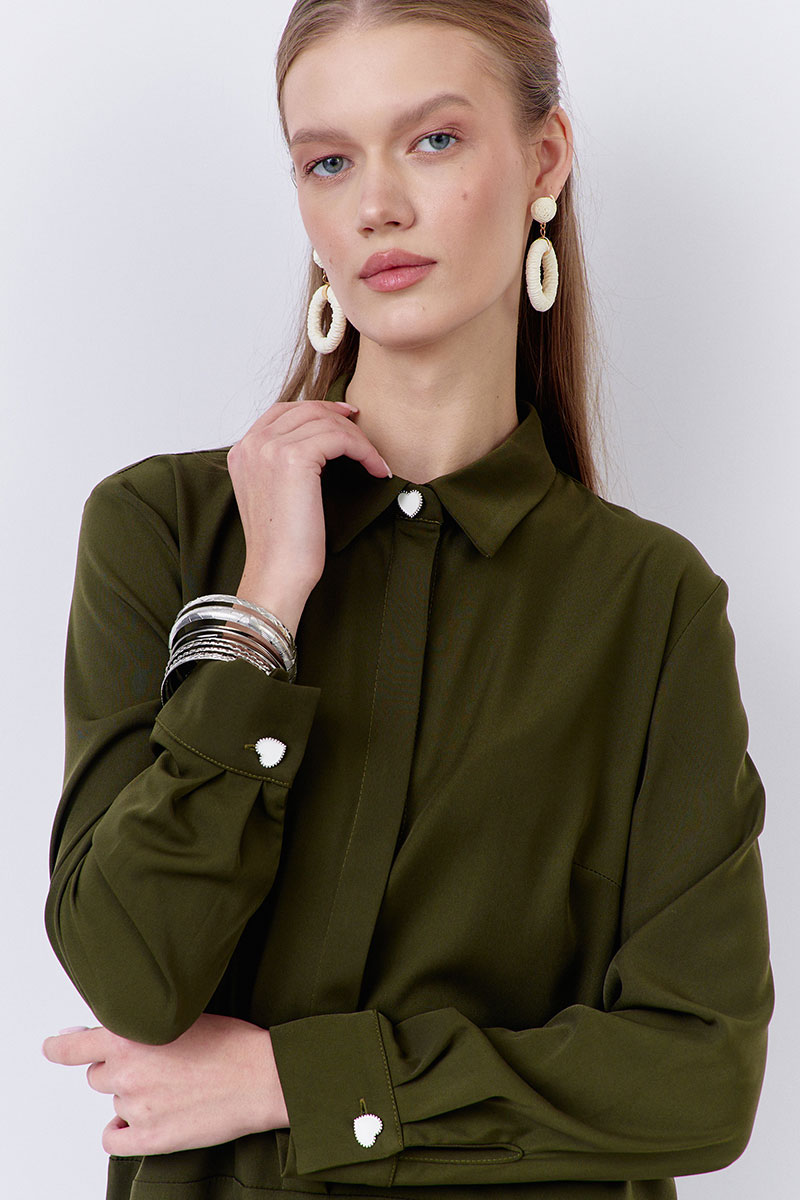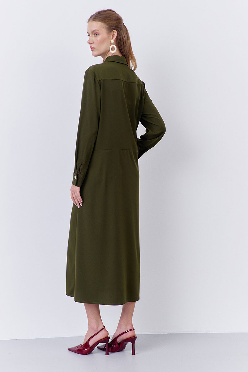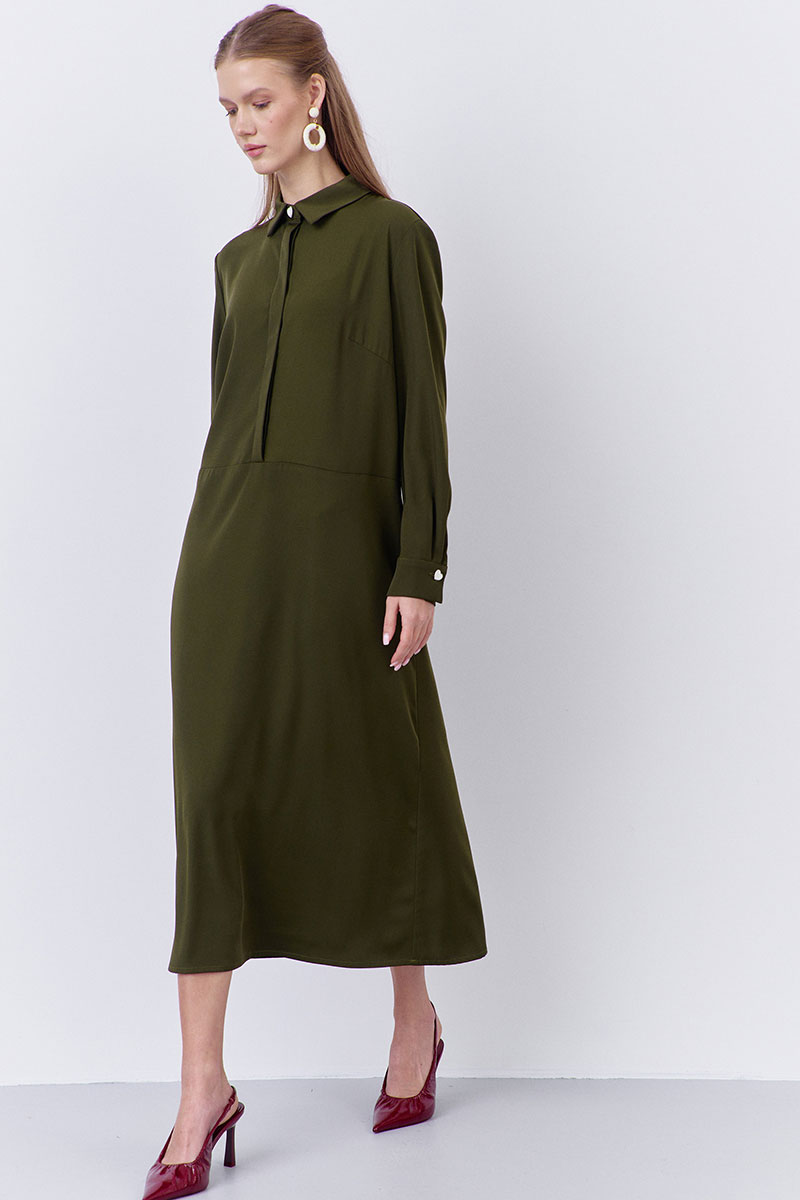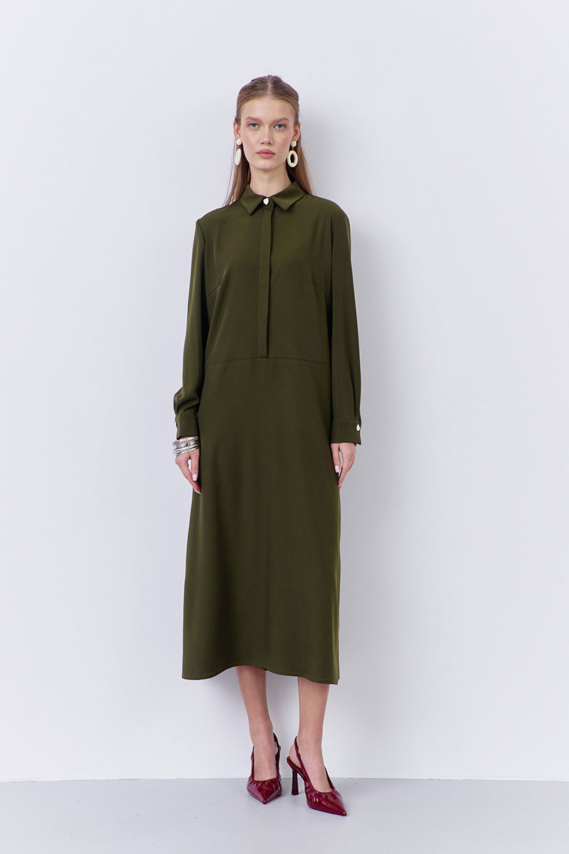 Платье прямого силуэта с потайной застежкой по переду. Характеристики: выполнено из плательной ткани в цвете хаки, застежка на петли и пуговицы, отрезное по талии, по низу рукавов манжеты.