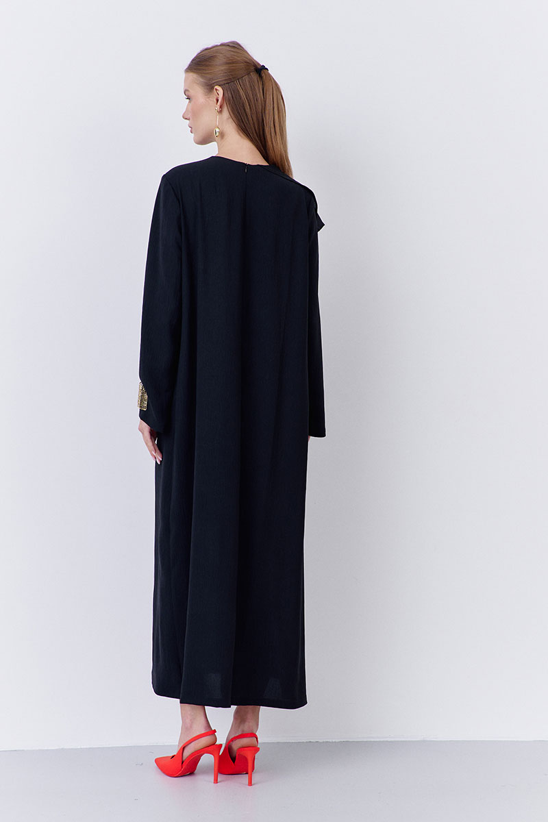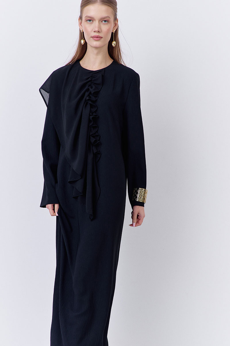 Платье прямого силуэта с декоративным элементом по переду. Характеристики: выполнено из плательной ткани в черном цвете, застежка-молния по спинке, по переду декоративный элеент из шифоновой ткани.