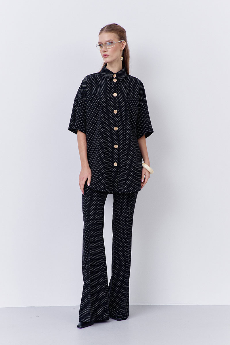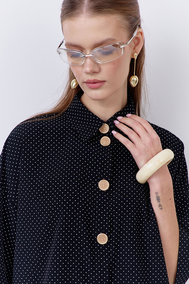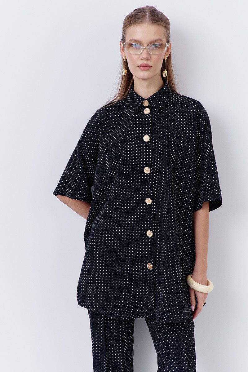 Блузка свободного силуэта в принте черный горох. Характеристики: центральная застежка на петли и декоративные пуговицы.