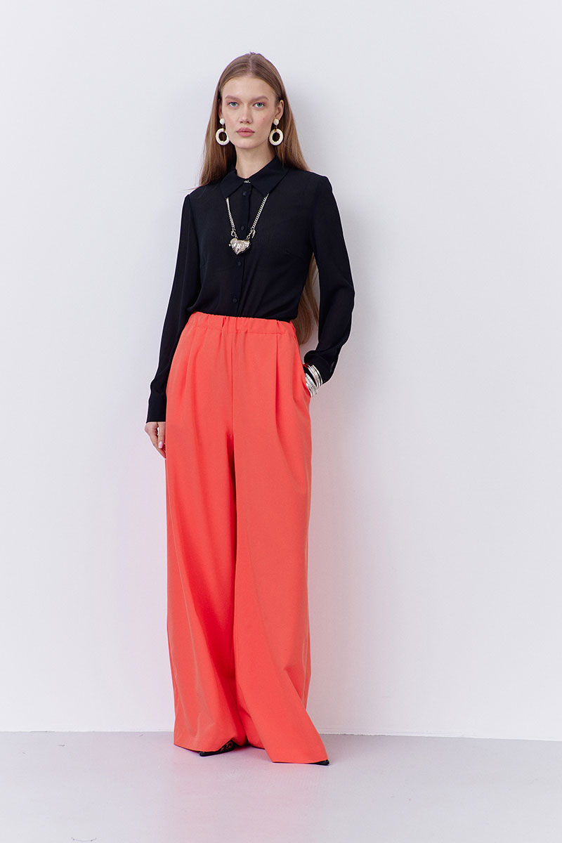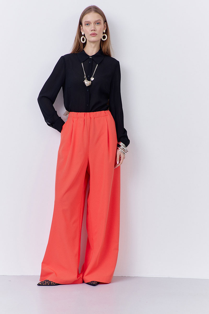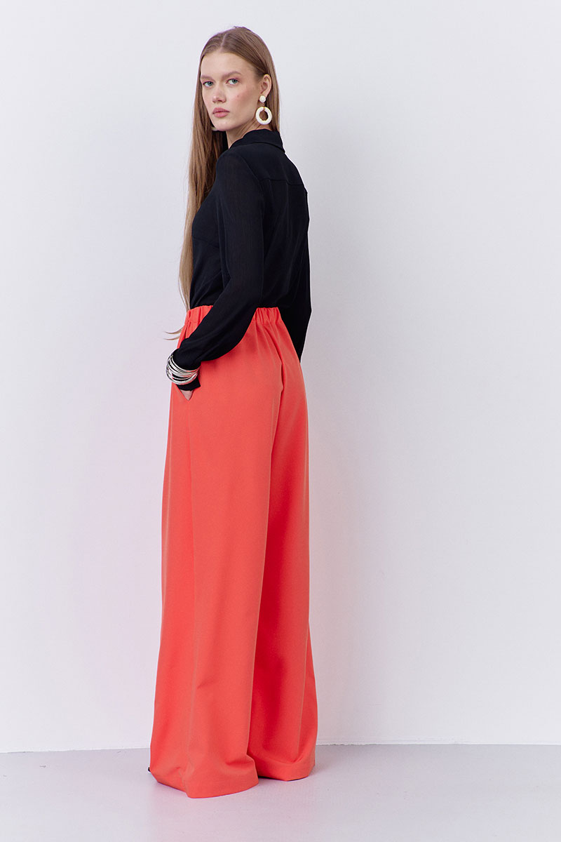 Брюки-палаццо свободного силуэта. Выполнены из плательной ткани в оранжевом цвете. Пояс брюк на резинке, в боковых швах карманы.