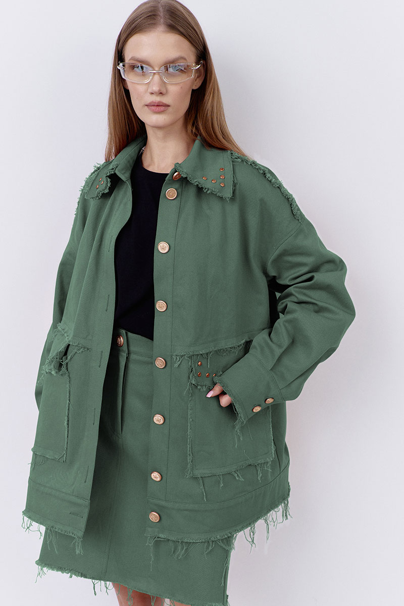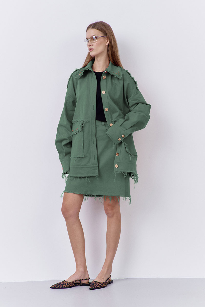 Джинсовый бомбер в цвете зеленый мох. Характеристики: бомбер свободного силуэта выполнен из джинсовой ткани, центральная застежка на петли и пуговицы, по переду карманы с клапаном, низ рукавов и бомбера обработаны притачной манжетой, воротник рубашеного типа, по воротнику и клапанам клепки.