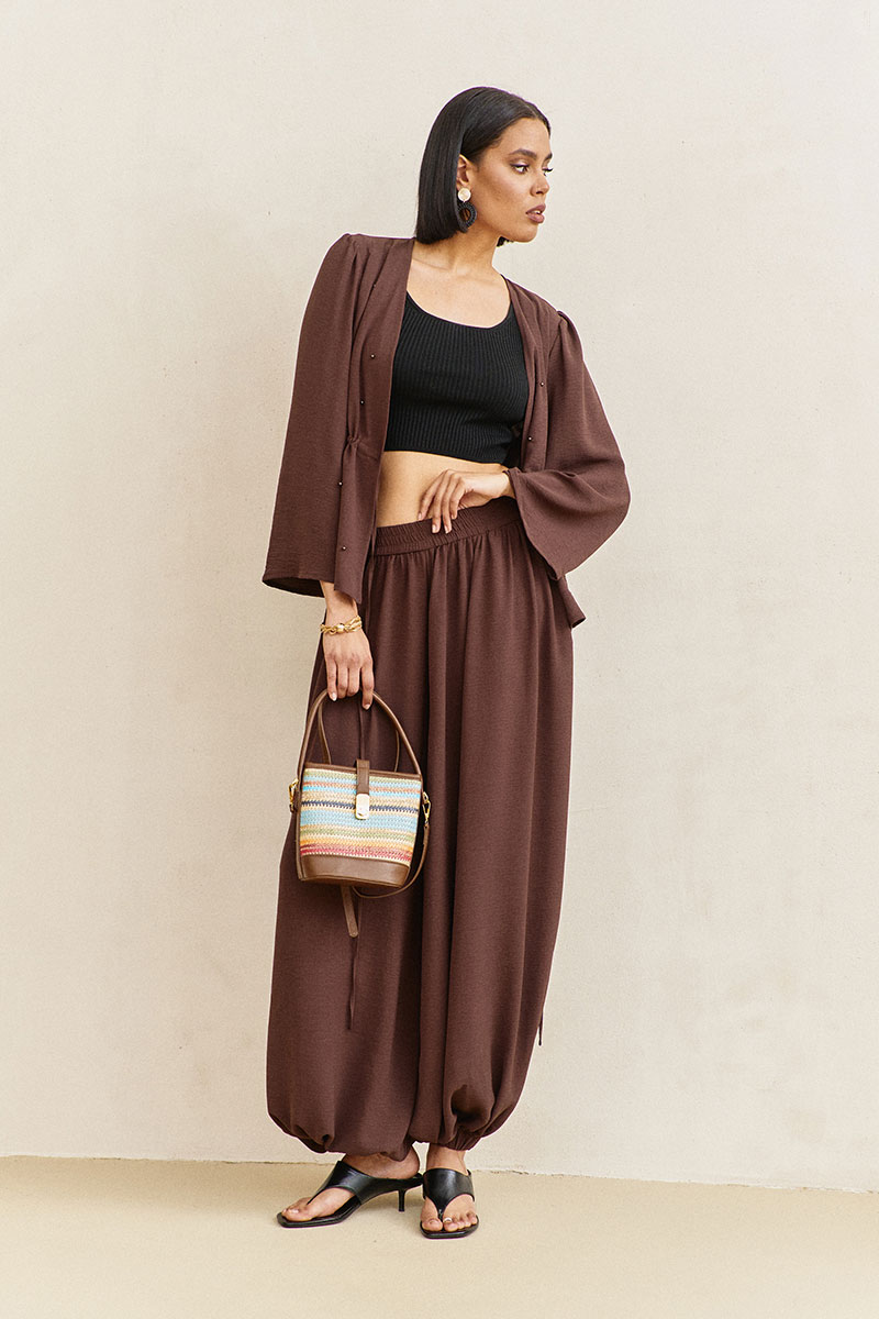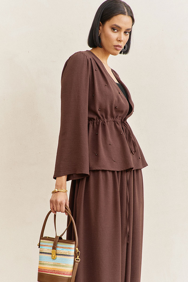 Блузка полуприталенного силуэта с кулисой по талии. Характеристики: выполнена из костюмно-плательной ткани в коричневом цвете, по талии кулиса, по переду бусины.