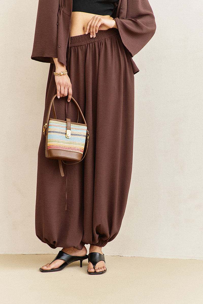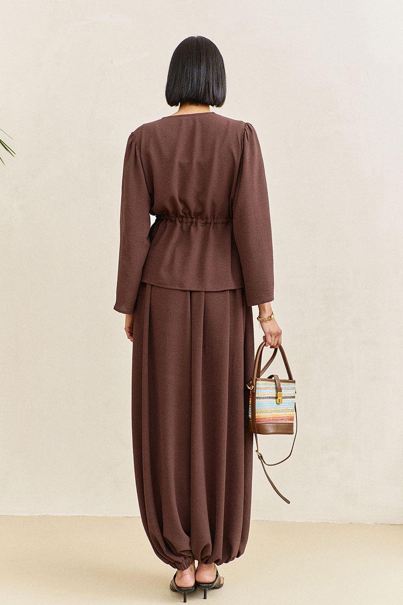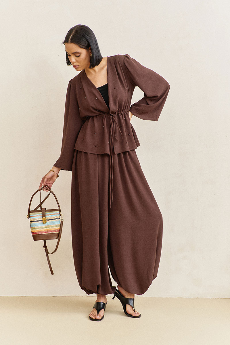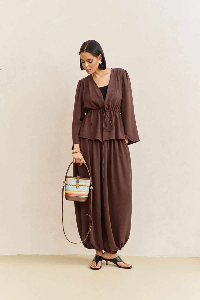 Блузка полуприталенного силуэта с кулисой по талии. Характеристики: выполнена из костюмно-плательной ткани в коричневом цвете, по талии кулиса, по переду бусины.