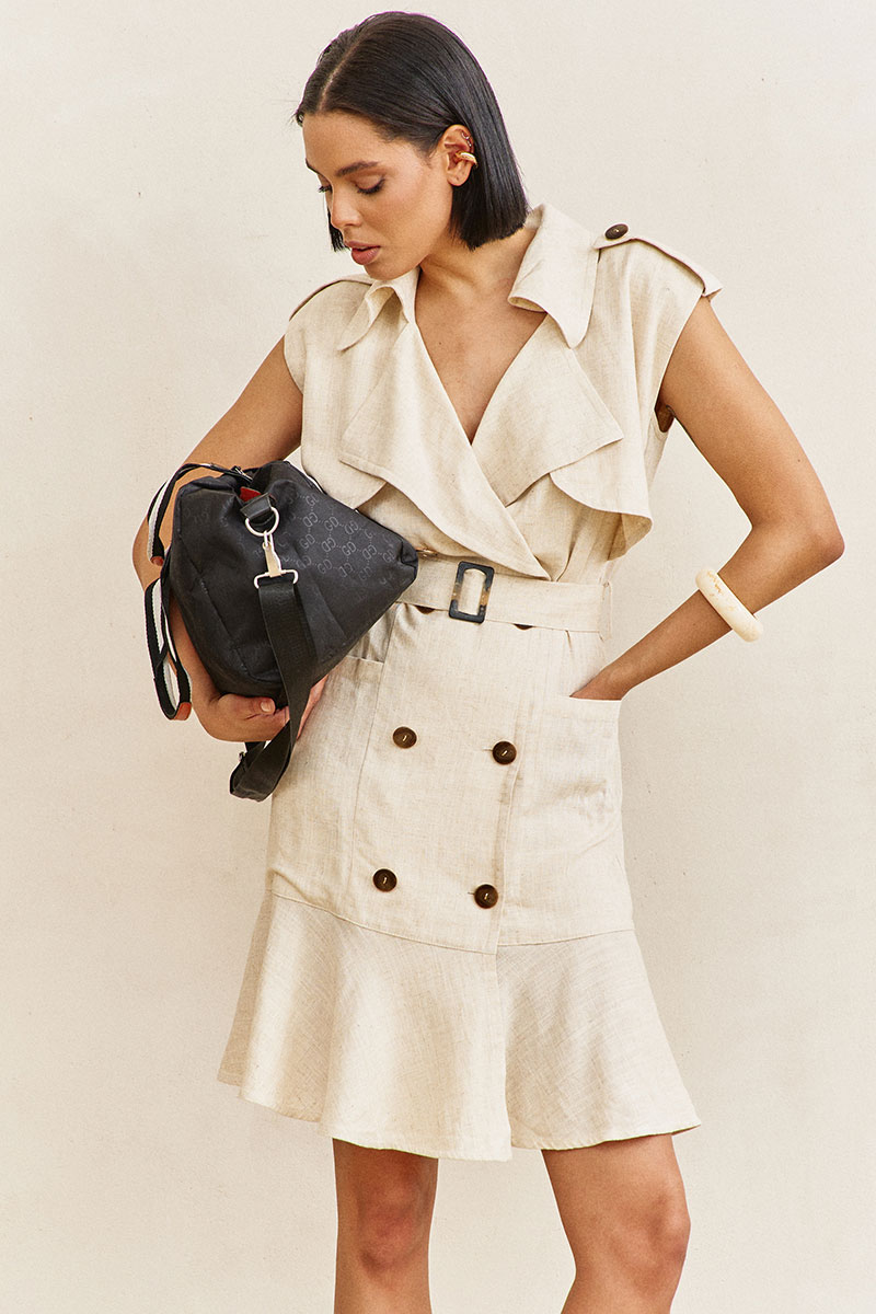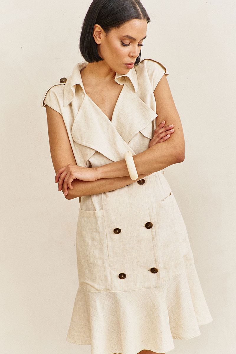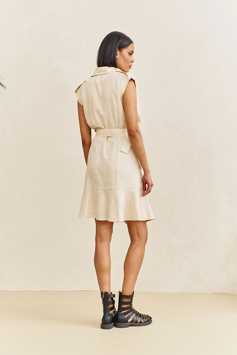 Платье-тренч с кокетками и воланом. Характеристики: выполнено из плательной ткани в бежевом цвете, со смещенной застежкой на петли и пуговицы, по переду отлетные кокетки, волан по переду и спинке, пояс съемный, по плечам паты.
