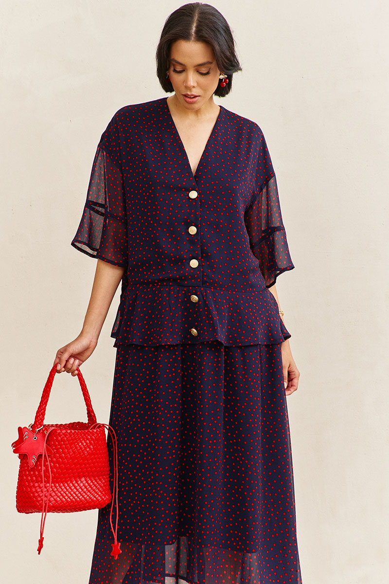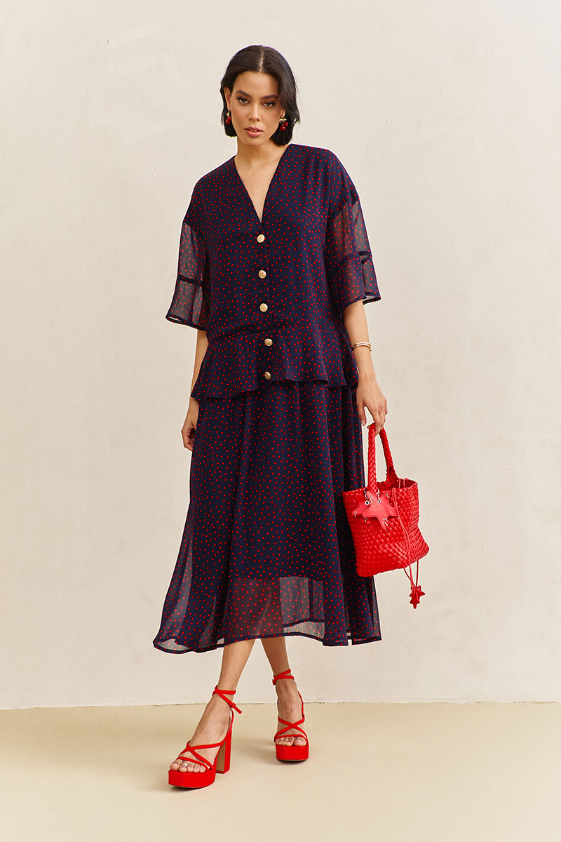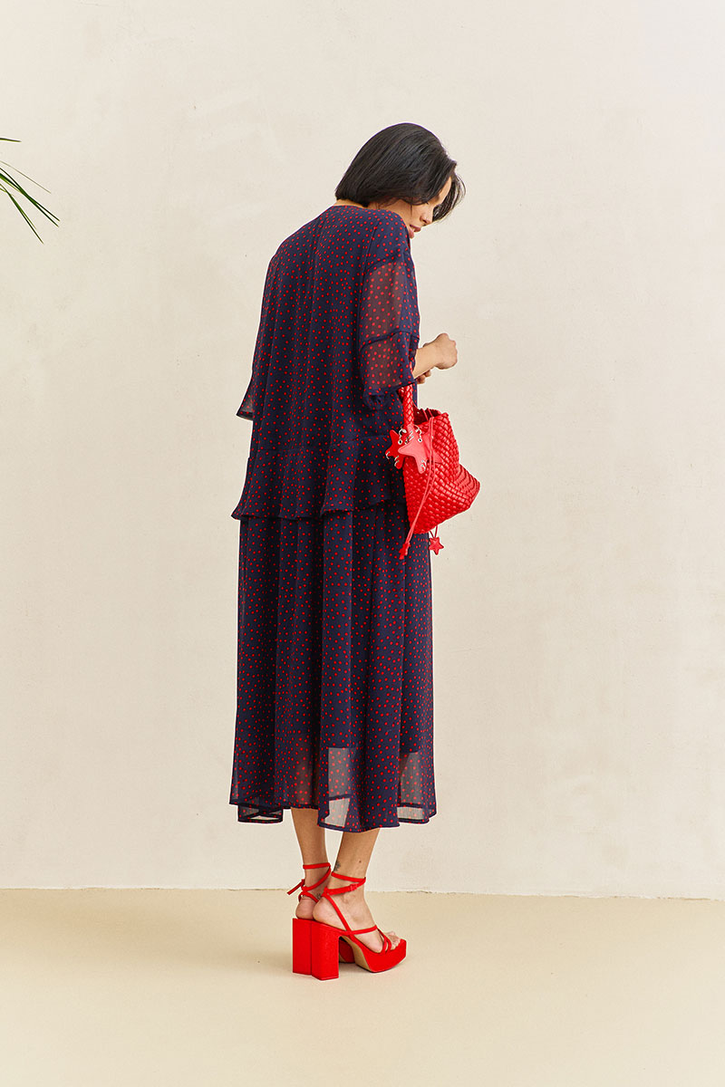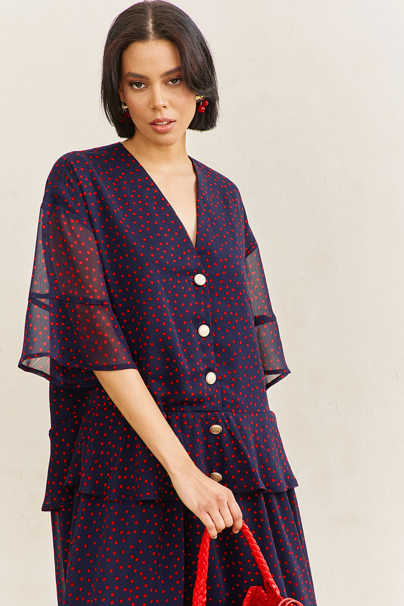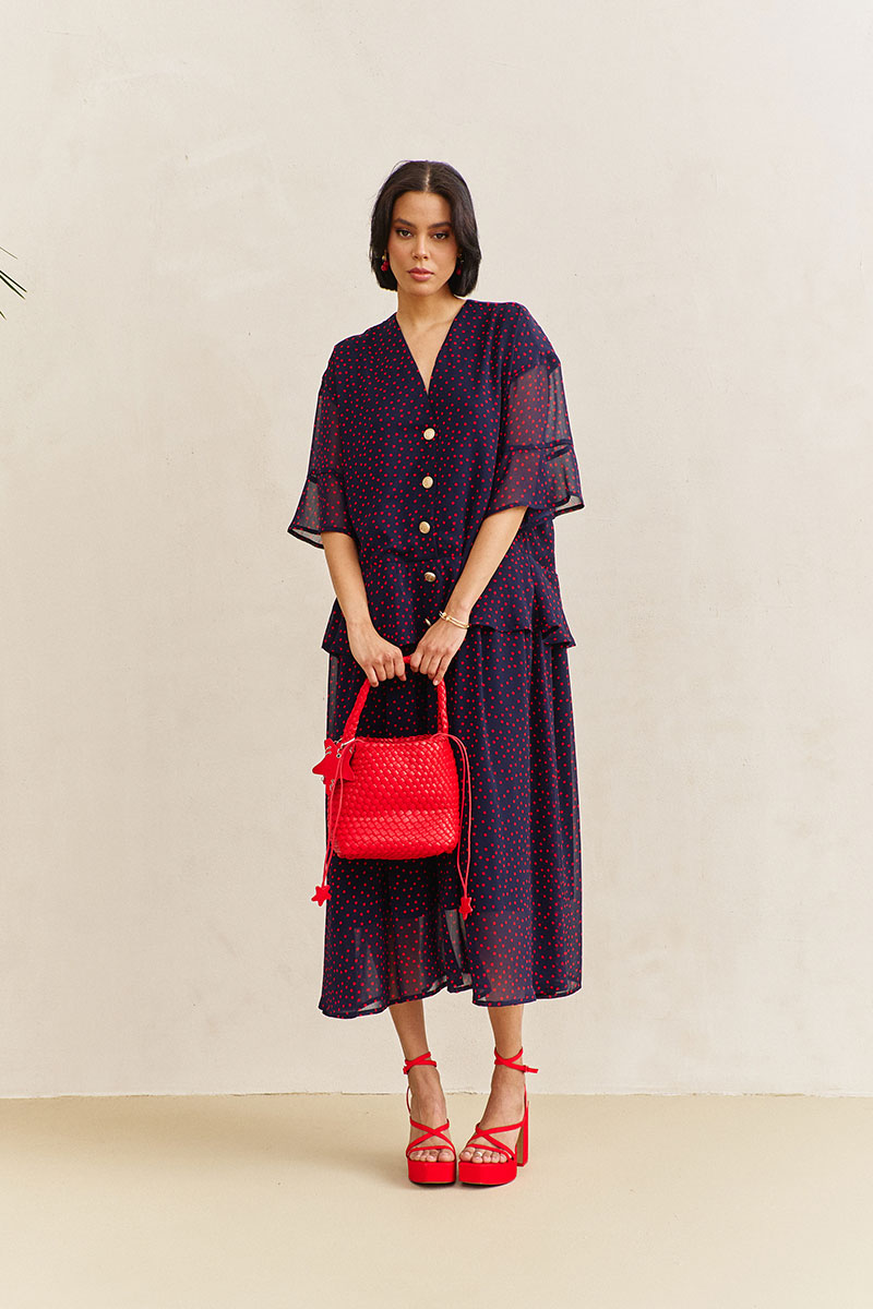 Платье свободного силуэта. Характеристики: выполнено из плательной ткани в цвете синий+красный горох. По переду и спинке волан по талии. Застежка на петли и пуговицы по переду. Платье на трикотажной подкладке.