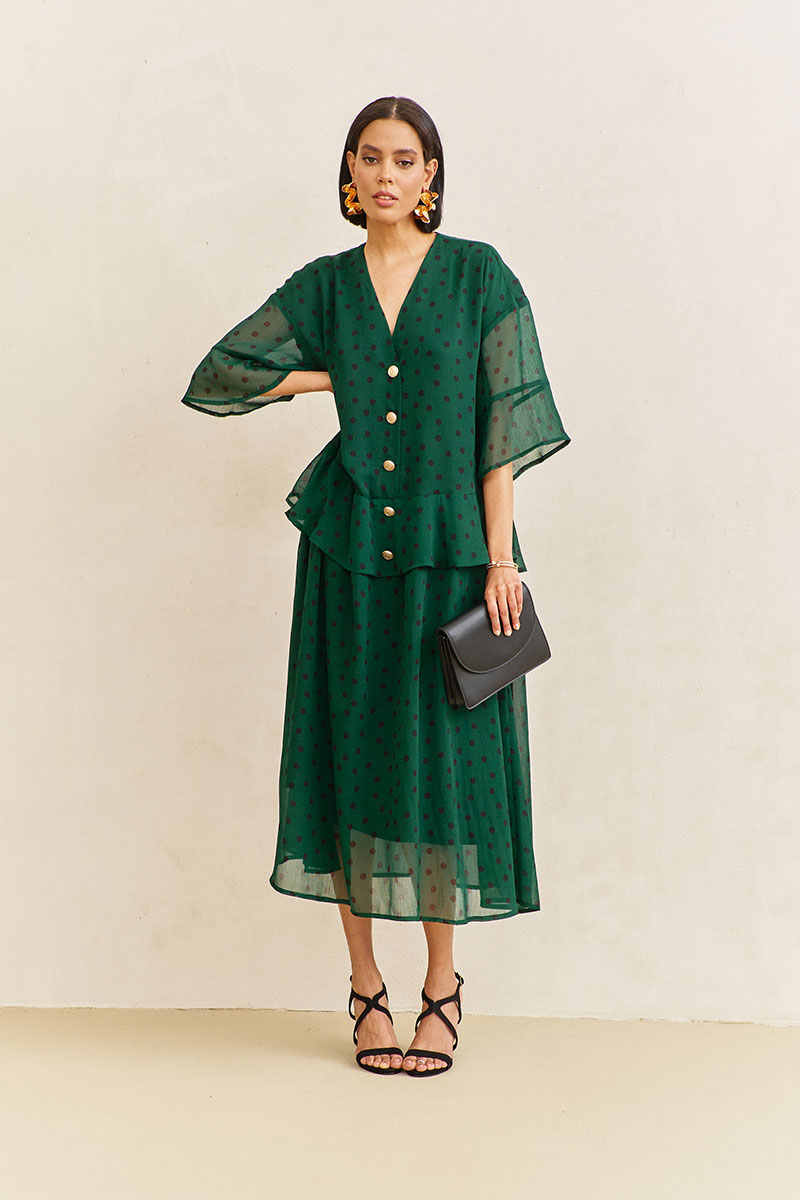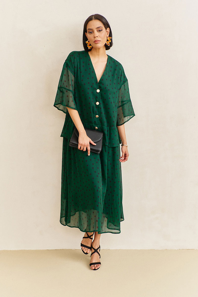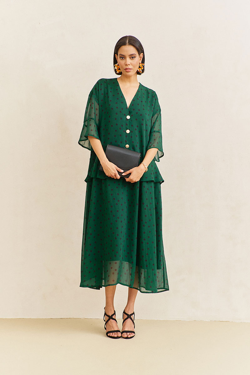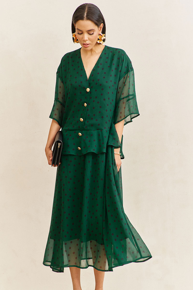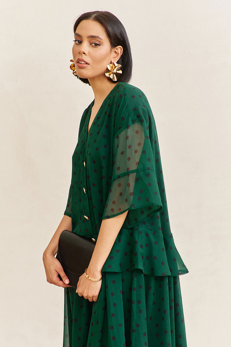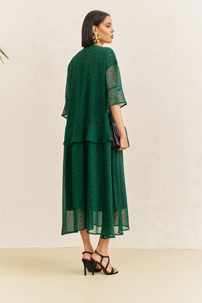 Платье свободного силуэта. Характеристики: выполнено из плательной ткани в цвете зеленый+черный горох. По переду и спинке волан по талии. Застежка на петли и пуговицы по переду. Платье на трикотажной подкладке.