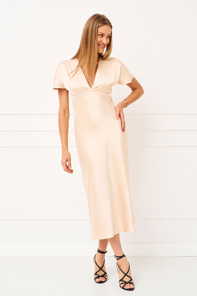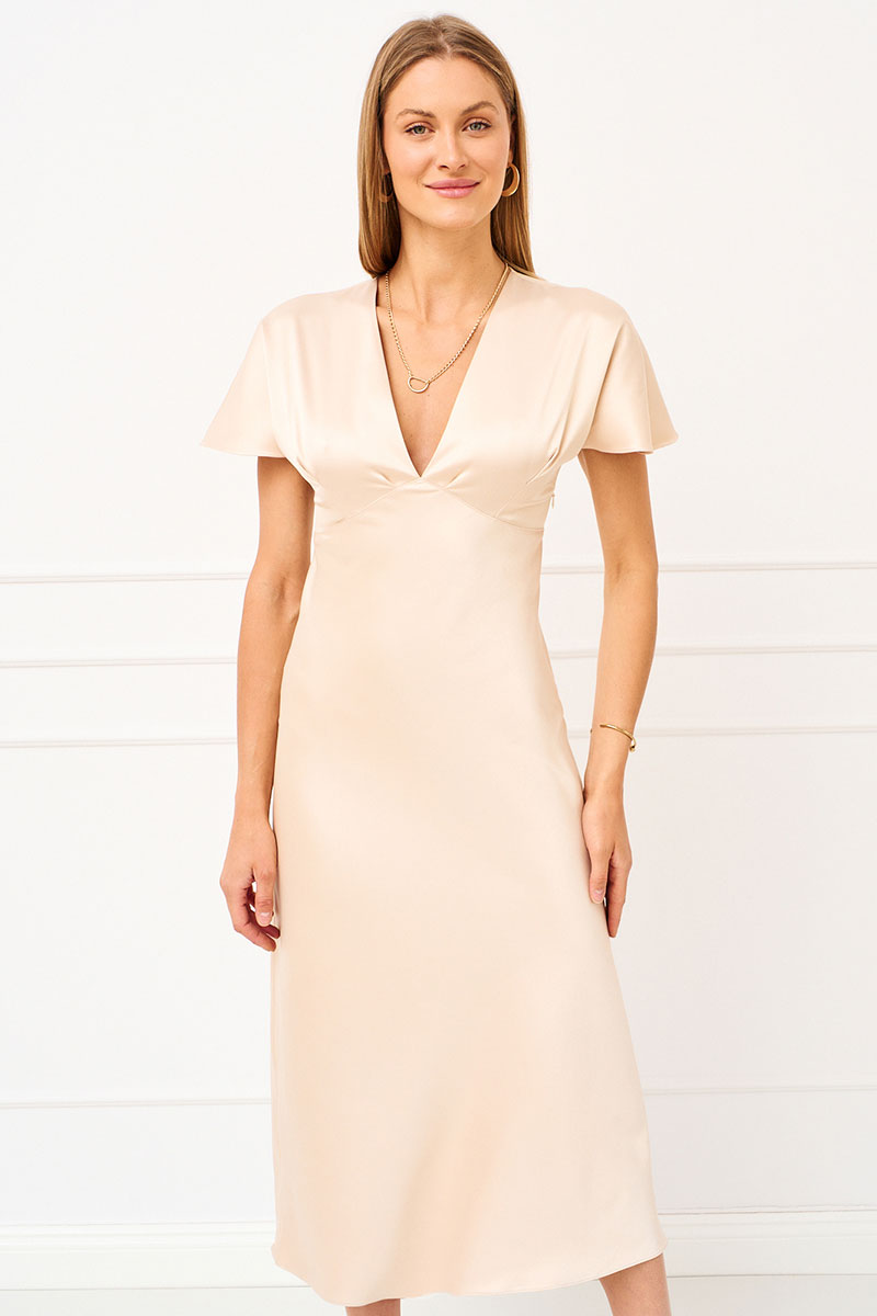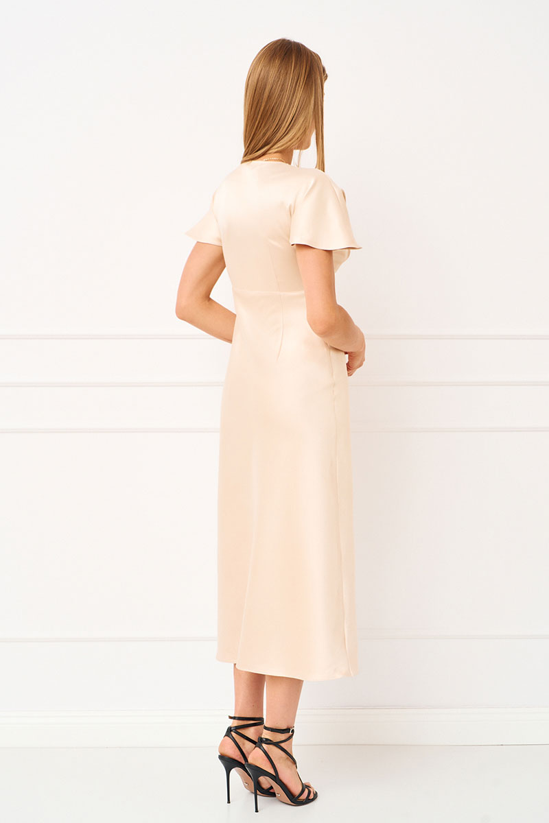 Женское платье полуприлегающего силуэта выполнено из плотного сатина с подрезами и складками, расположенными под линией груди. Рукава цельнокроеные; горловина имеет v-образную форму; в боковом шве - молния. Платье полностью соответствует заявленному размеру. Пожалуйста, пользуйтесь таблицей замеров готового изделия.