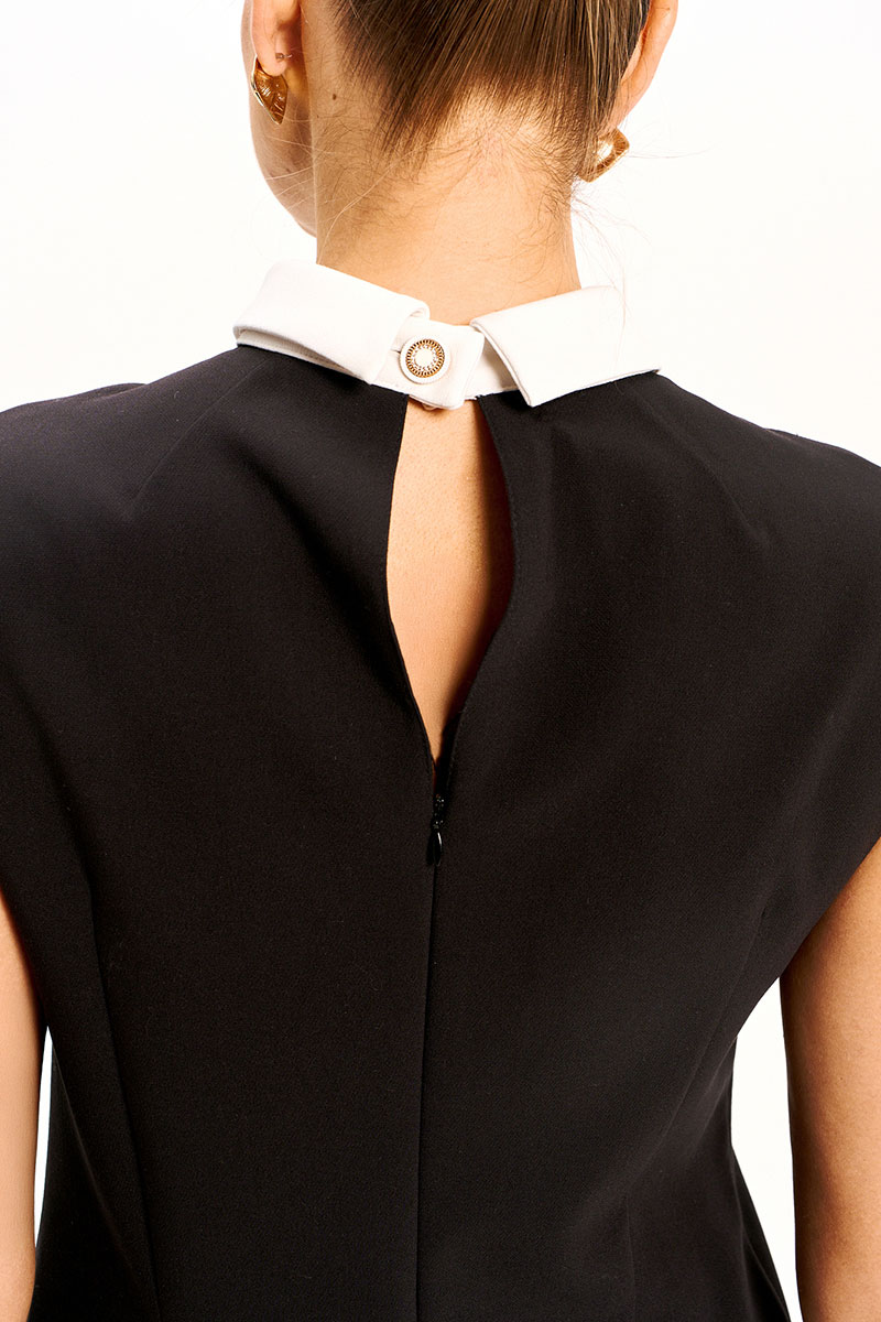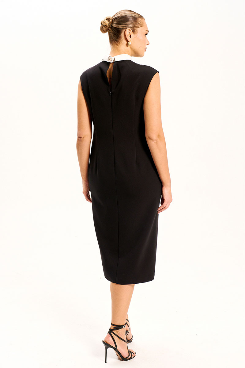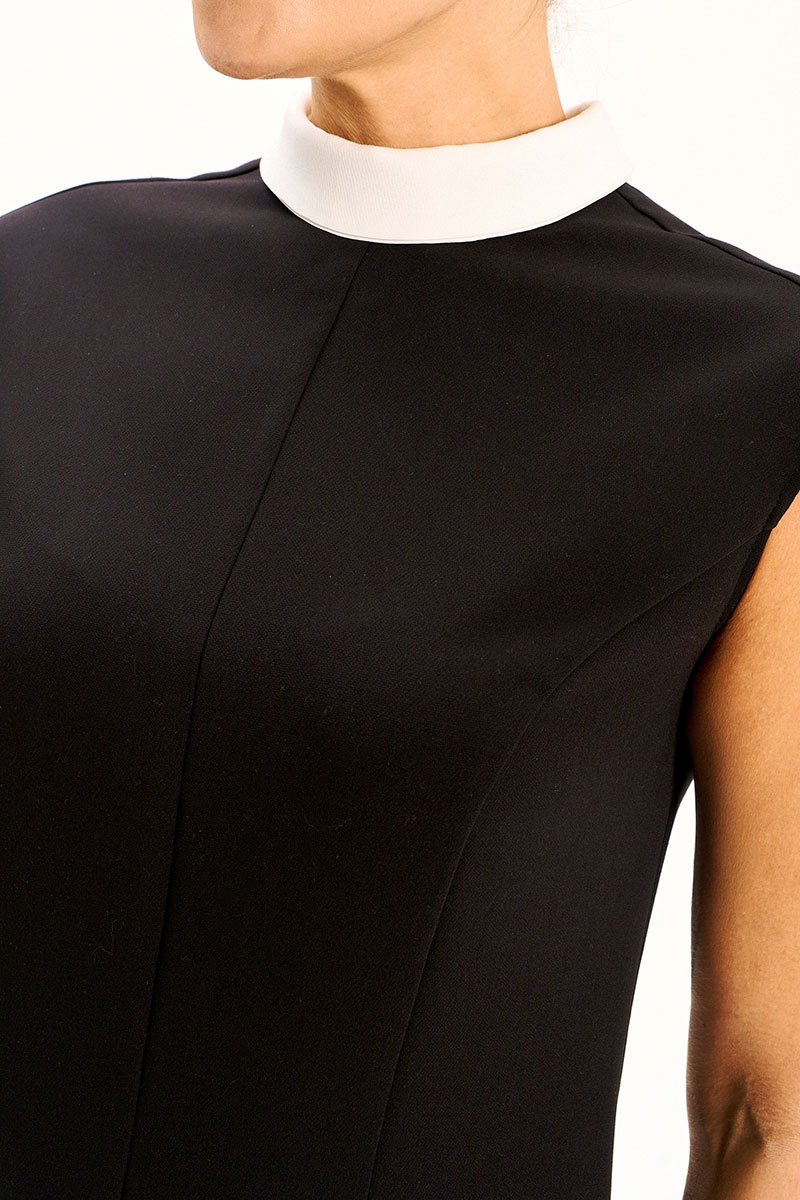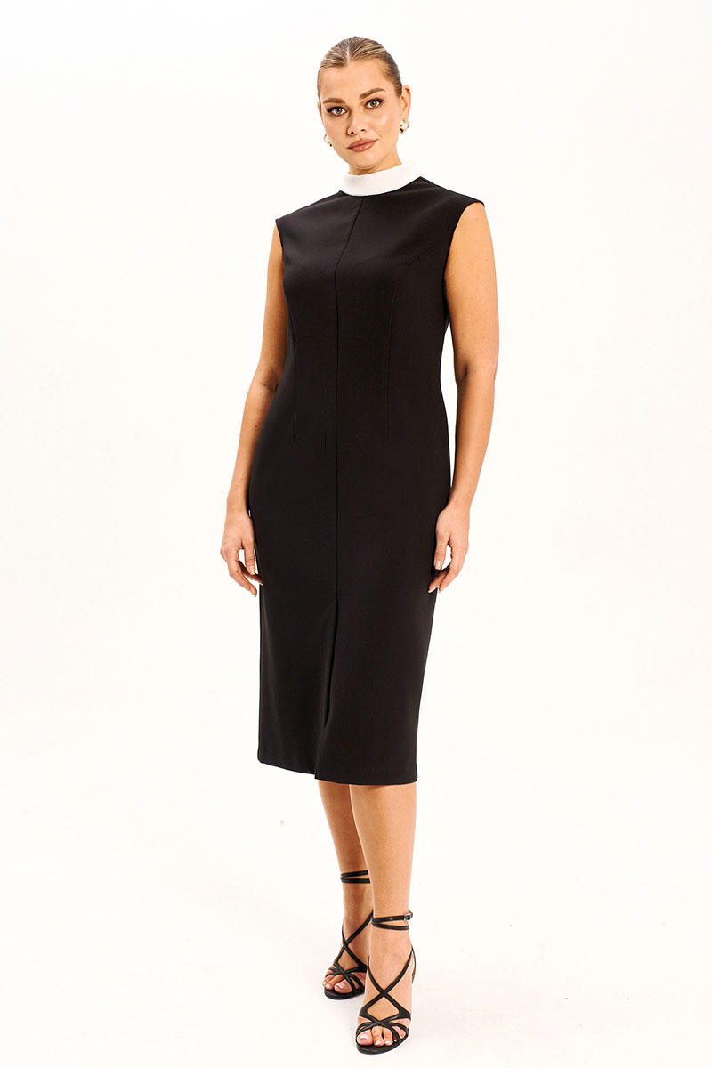 Платье полуприлегающего силуэта, выполнено из плательной ткани средней плотности с рельефами и разрезом по переду. Изделие имеет воротник - стойку контрастного молочного цвета из ткани- компаньона ( платье прошло тестовую стирку при температуре 30 градусов - не линяет). По спинке застежка на потайную молнию, петлю и пуговицу. Платье полностью соответствует заявленному размеру. Пожалуйста, пользуйтесь таблицей замеров готового изделия, чтобы подобрать идеальный размер.