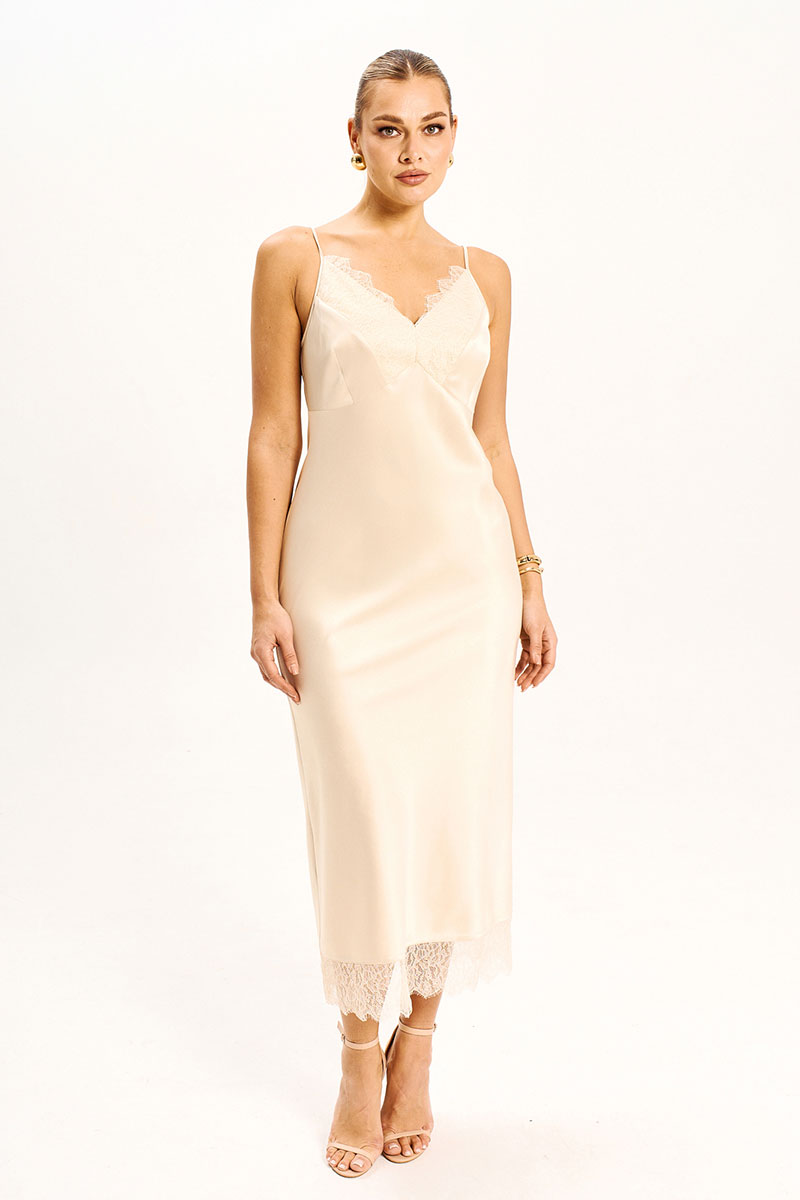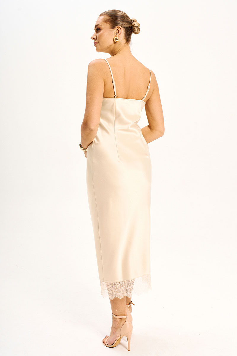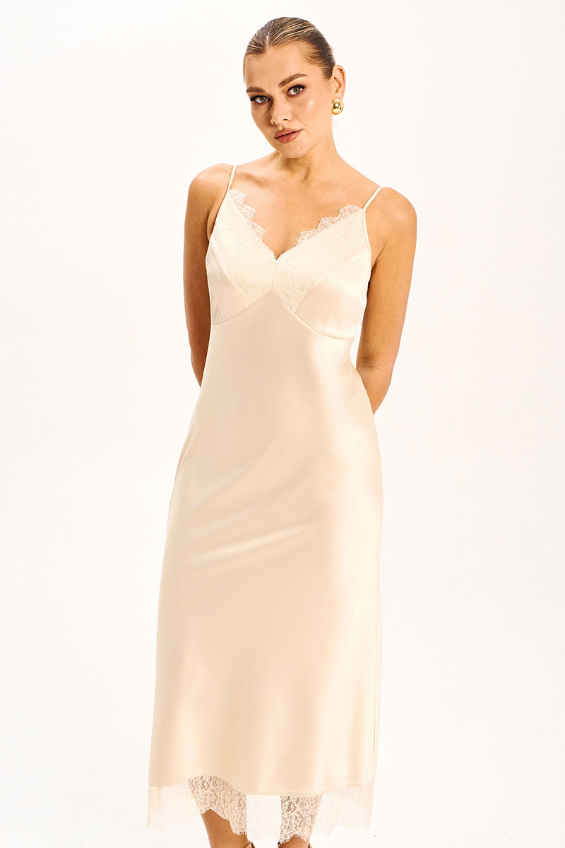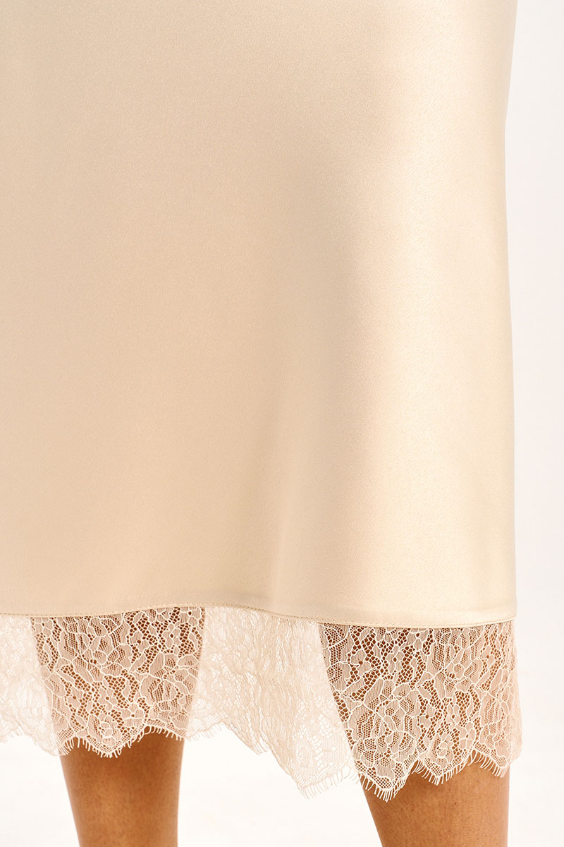 Платье - миди прилегающего силуэта выполнено из струящегося шелк - сатина на регулируемых бретелях и молнией в боковом шве. Подрезы по линии груди и низу платья дополнены мягким французким кружевом, которое держит форму. Платье полностью соответствует заявленному размеру. Пожалуйста, пользуйтесь таблицей замеров готового изделия, чтобы подобрать идеальный размер. Уход за платьем: - при стирке в стиральной машине выбрать бережный либо деликатный режим; - температура воды не выше 30 градусов. ( платье прошло тестовую стирку не линяет).