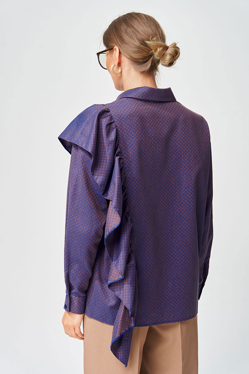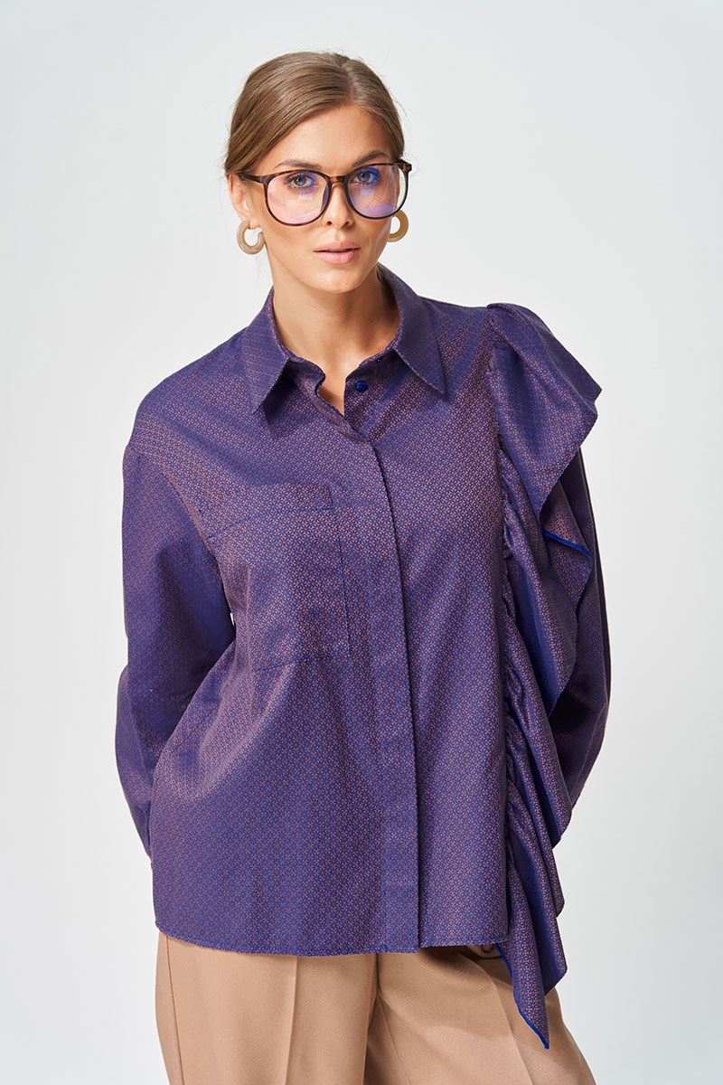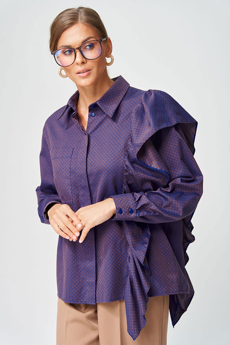 Рубашка прямого силуэта выполнена из хлопковой ткани с оригинальным жаккардовым переплетением. Перед с центральной застежкой потайной планкой. Левая часть переда и спинка с воланом на сборке вставленном в рельеф. На правой части переда настрочен карман. Рукав втачной одношовный с манжетой по низу, на манжете застежка на 2 петли и пуговицы. Воротник отложной со стойкой. Данная модель прекрасно сочетается с другими моделями из нашей коллекции 35204. Создайте гармоничный образ, комбинируя эти изделия!