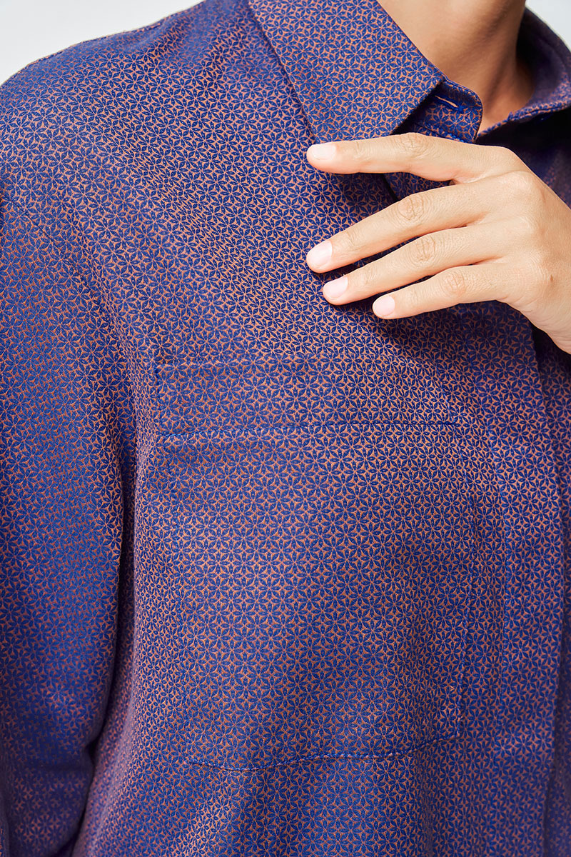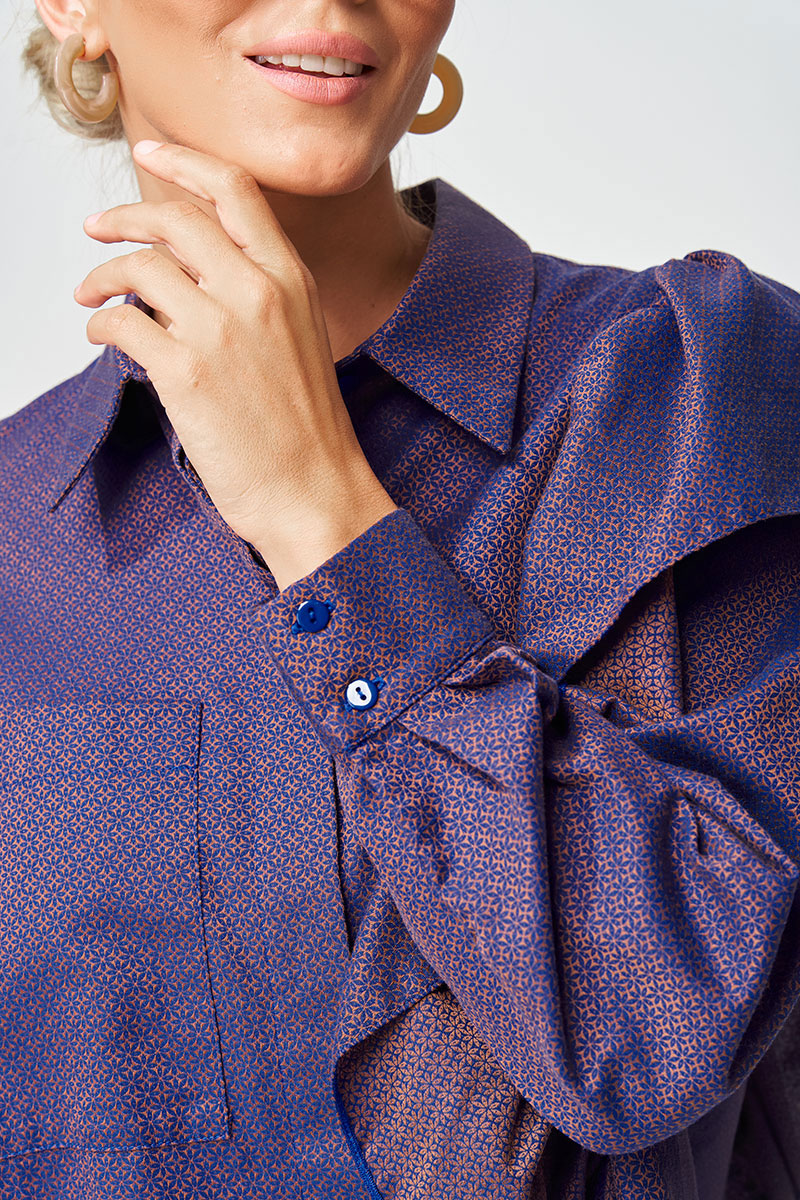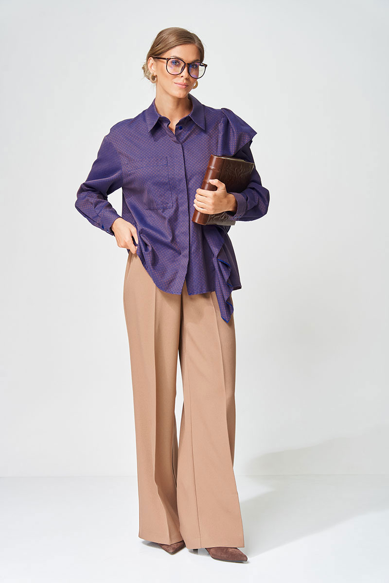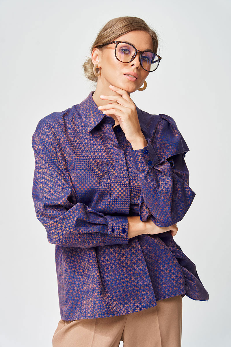 Рубашка прямого силуэта выполнена из хлопковой ткани с оригинальным жаккардовым переплетением. Перед с центральной застежкой потайной планкой. Левая часть переда и спинка с воланом на сборке вставленном в рельеф. На правой части переда настрочен карман. Рукав втачной одношовный с манжетой по низу, на манжете застежка на 2 петли и пуговицы. Воротник отложной со стойкой. Данная модель прекрасно сочетается с другими моделями из нашей коллекции 35204. Создайте гармоничный образ, комбинируя эти изделия!
