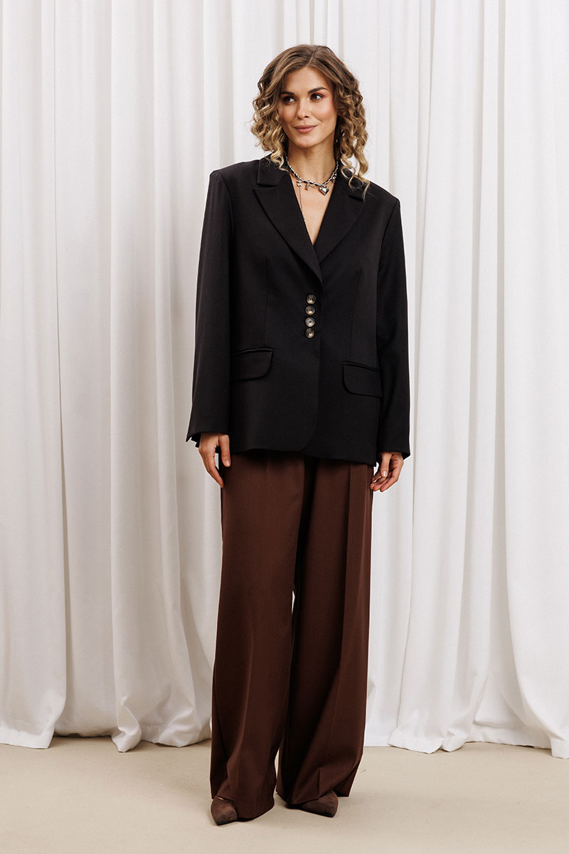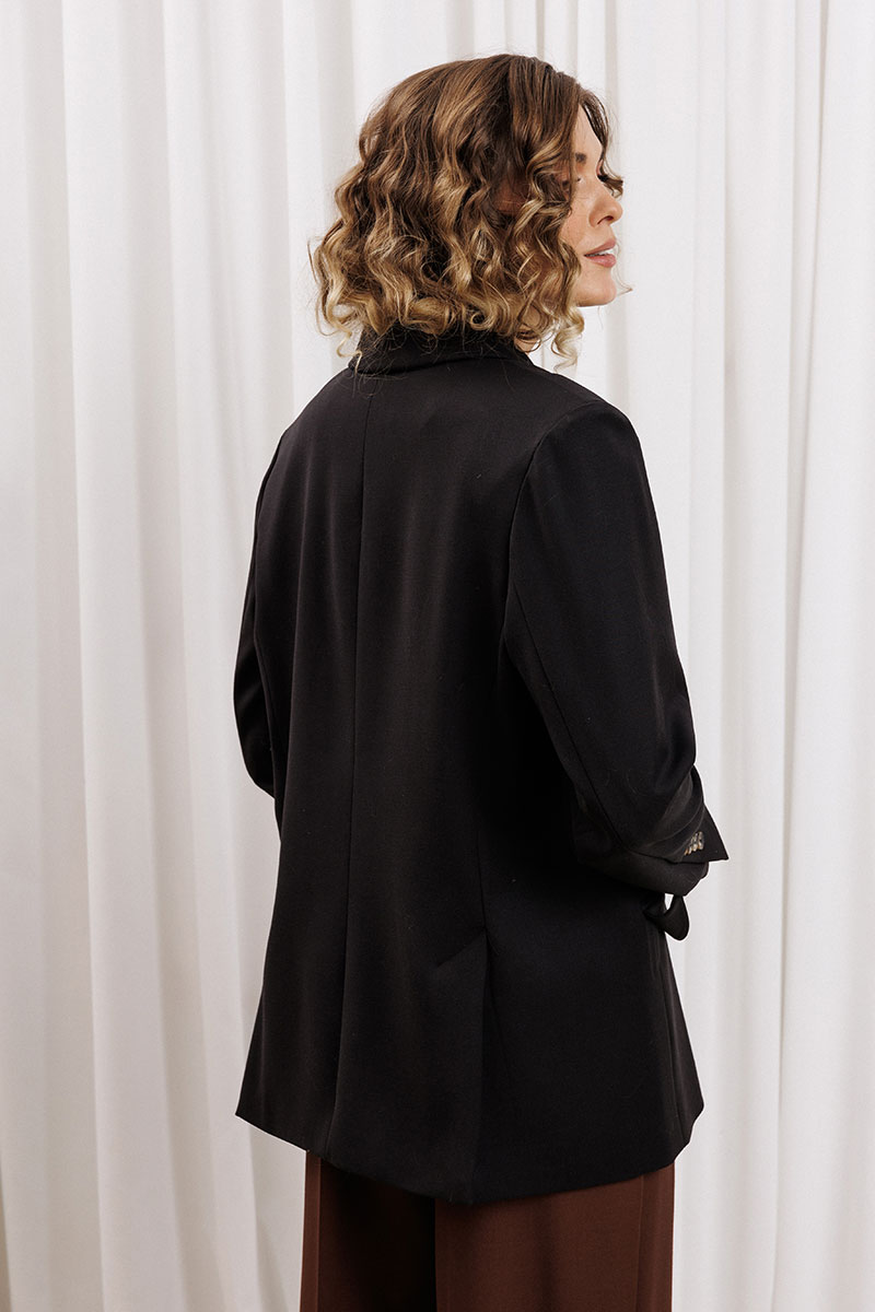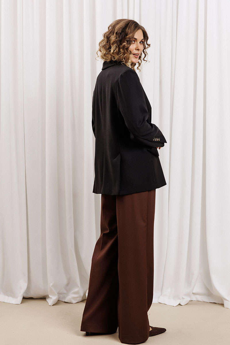 Жакет прямого свободного силуэта из костюмной ткани. Воротник пиджачного типа, застежка обнобортная на 4 петли и пуговицы. Перед с талиевой вытачкой и карманом с клапаном в рамку, с рельефом. Спинка со средним швом и рельефами, в рельефах шлица. Рукав втачной одношовный со шлицей и 4-мя пуговицами. Жакет на подкладке.