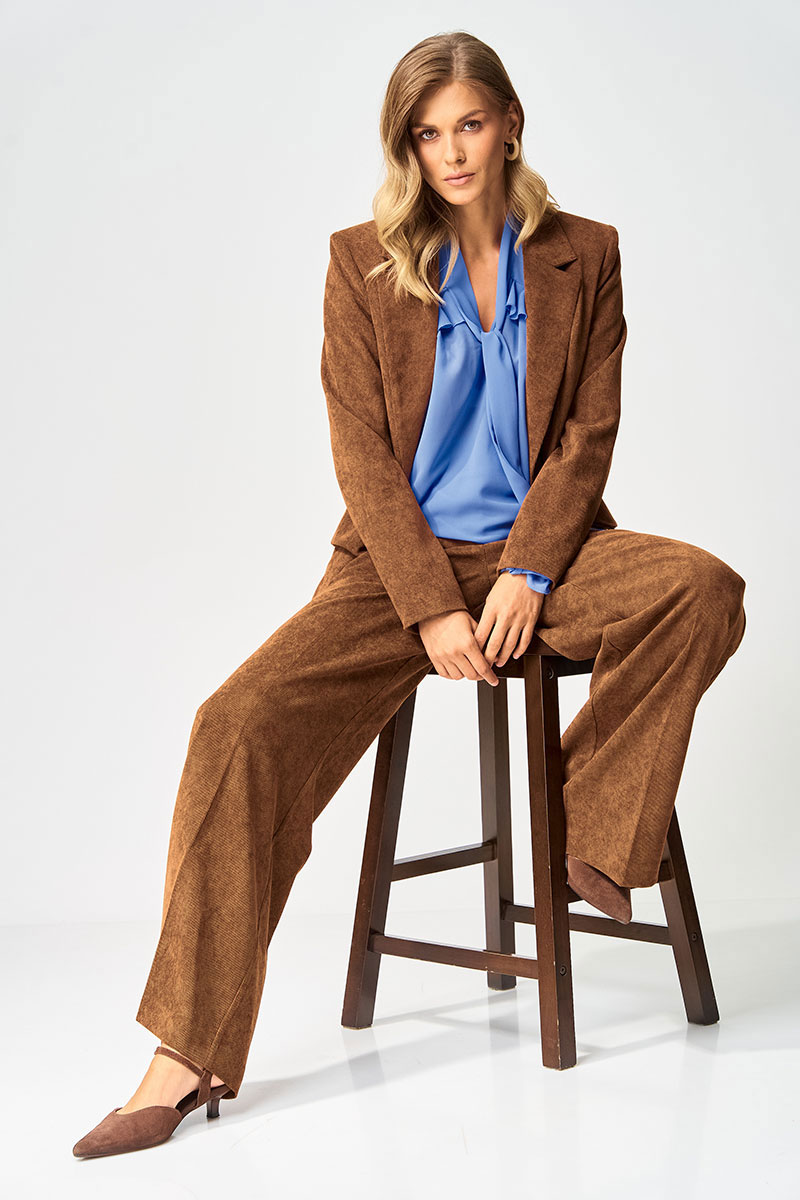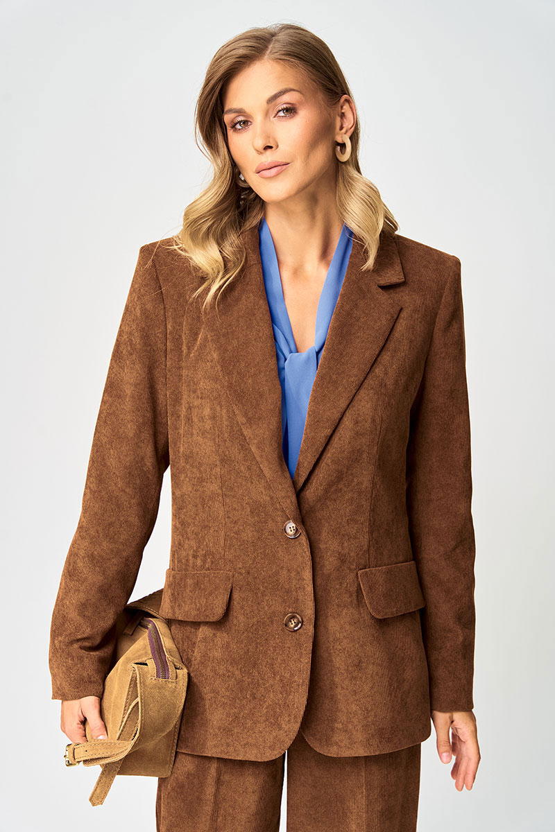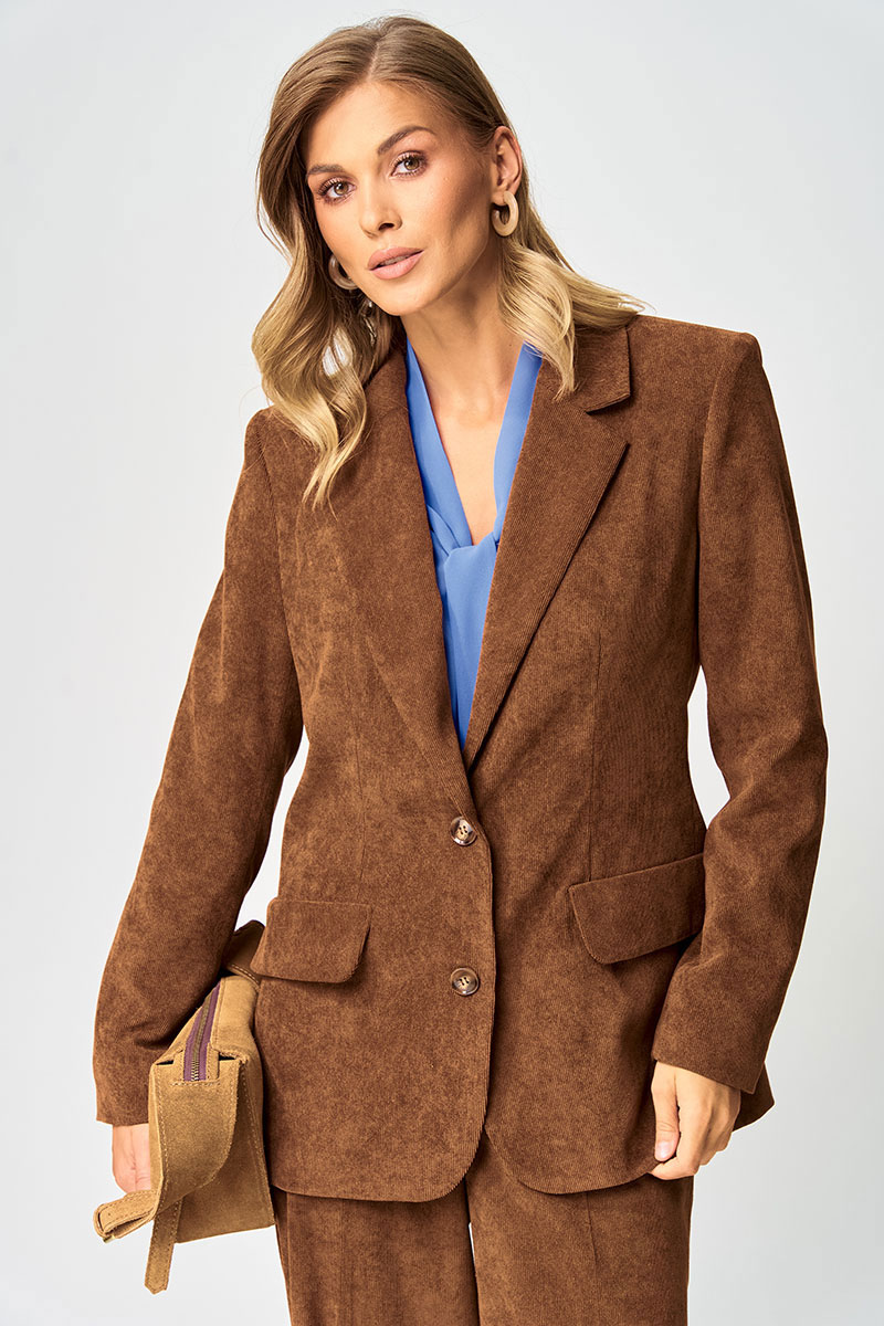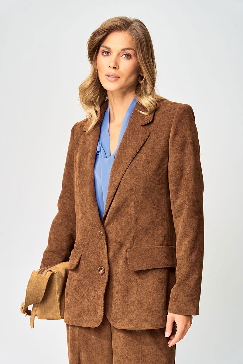Жакет полуприлегающего силуэта из мягкой вельветовыой ткани приятного каштанового цвета. Застежка однобортная на две пуговицы, воротник пиджачного типа. Перед с талиевой вытачкой, рельефом и декоративным клапаном. Спинка с рельефами из проймы и средним швом. Рукав втачной двухшовный. Жакет на подкладке. Данная модель прекрасно сочетается с другими моделями из нашей коллекции 35204 в этом же цвете и 15410. Создайте гармоничный образ, комбинируя эти изделия!