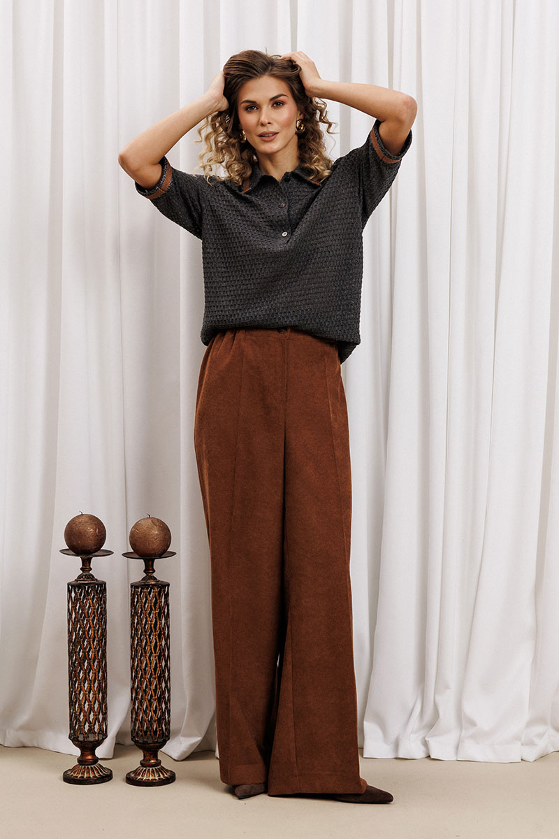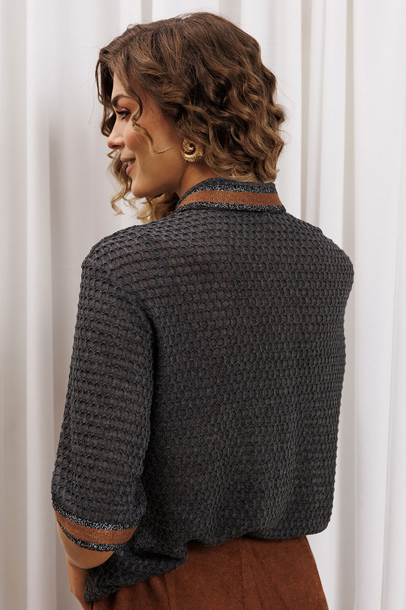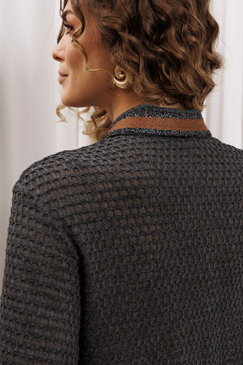 Джемпер прямого силуэта из трикотажного трикотажного ажурного полотна. Перед с застежкой поло и нагрудными вытачками. По воротнику и низу рукава настрочена декоративная тесьма.