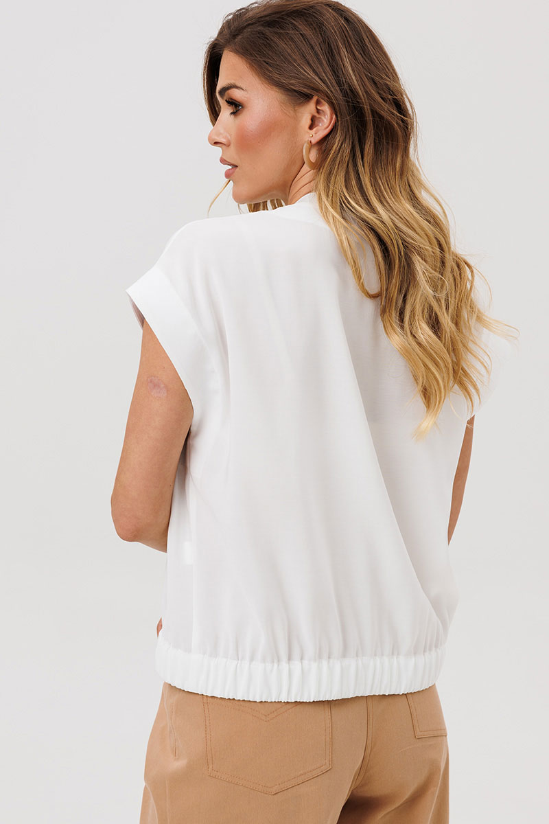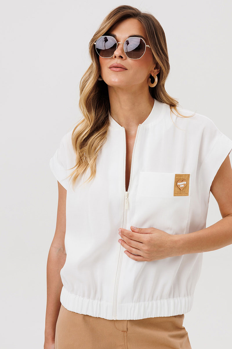 Жилет (бомбер) свободного силуэта из легкой летней вискоззной ткани. Перед на застежке на молнию, горловина обработана довязом. На левой части переда настрочен карман декорированый нашивкой. Бомбер по низу на резинке. Пройма обработана обтачкой.