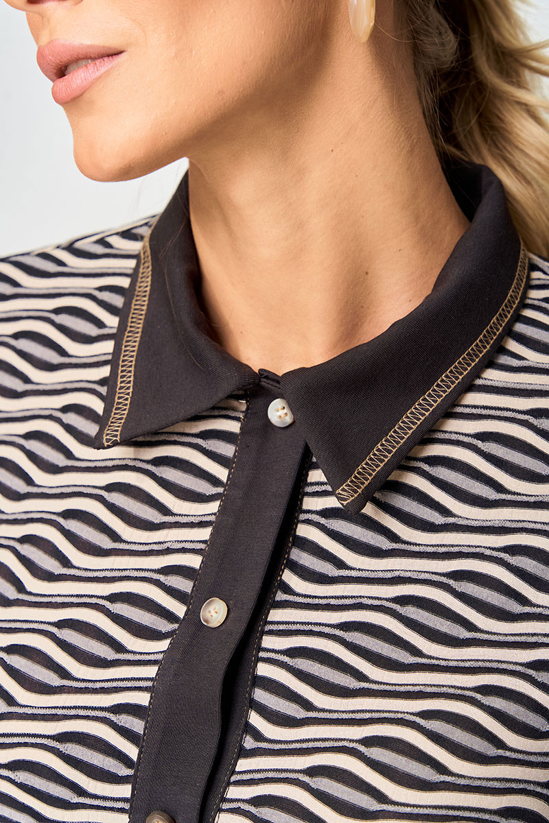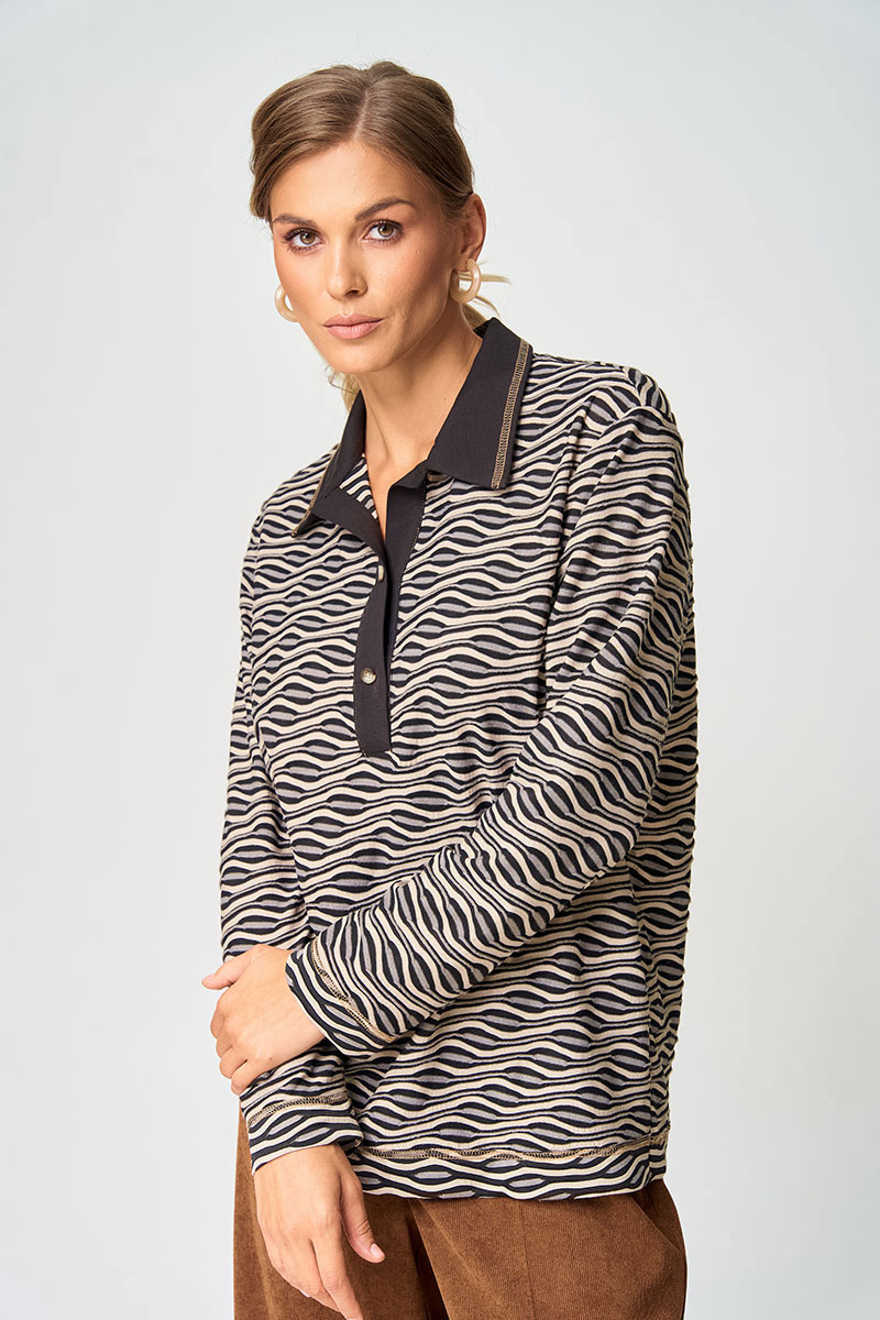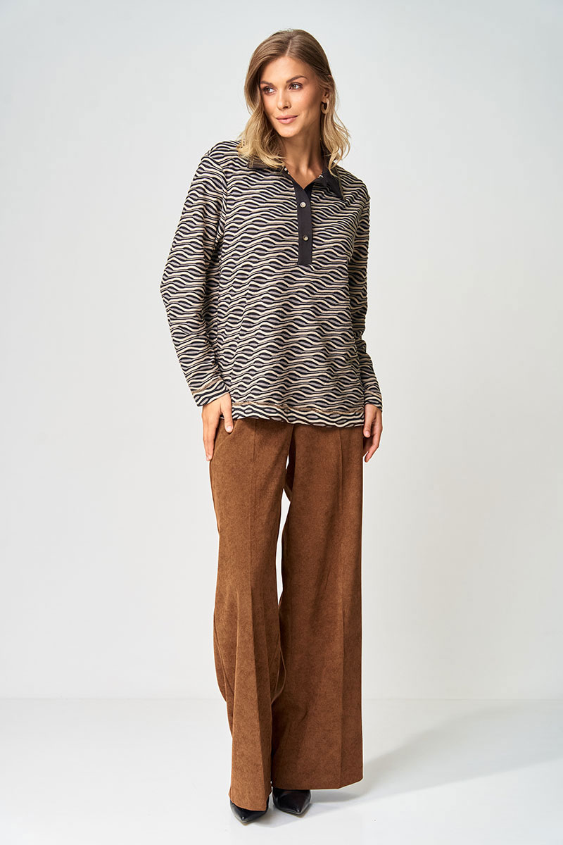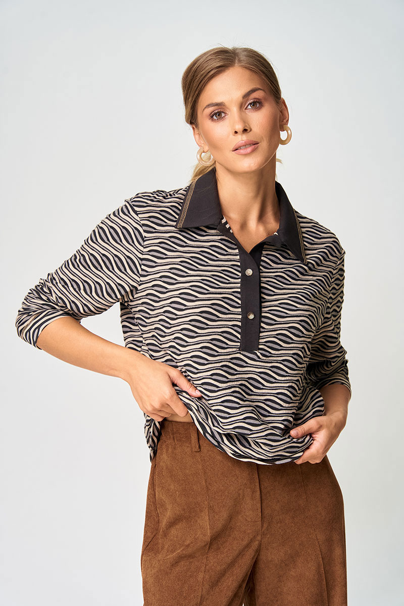 Джемпер прямого силуэта с воротником поло из трикотажной ткани с оригинальным рисунком. Рукав втачной одношовный. По низу изделия, по низу рукава и по воротнику проложена отделочная строчка. Данная модель прекрасно сочетается с другой моделью из нашей коллекции 35204. Создайте гармоничный образ, комбинируя эти изделия!