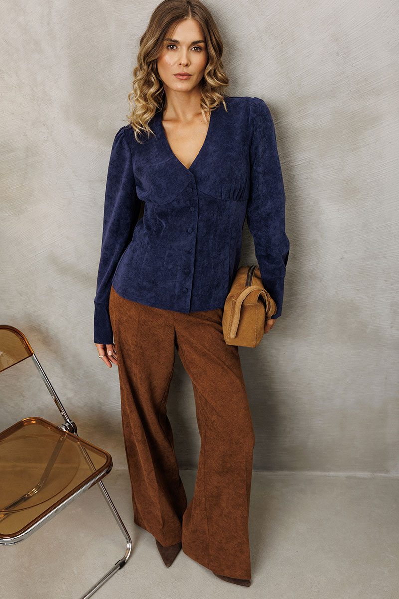 Блузка оригинальная приталенного силуэта из вельветовой ткани. Перед с подрезом под грудью, сборкой в районе груди и талиевыми вытачками. Затсежка на петли и пуговицы. Горловина V-образной формы. Спинка с талиевыми вытачками. Рукав втачной со сборкой по окату и с манжетой по низу. Манжета высокая с двумя петлями и пуговицами.