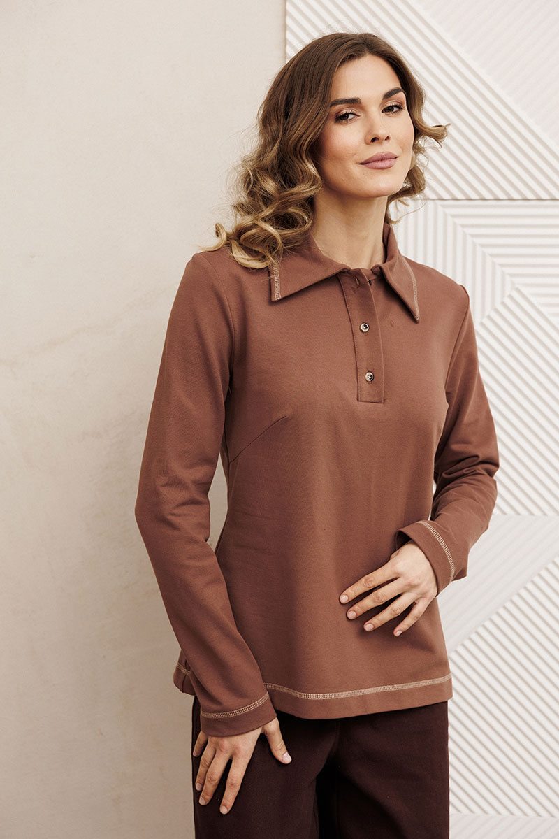 Джемпер прямого силуэта из трикотажного полотна. Перед с застежкой поло и нагрудными вытачками. По воротнику, низу изделия и низу рукава отстрочена декоративная строчка.