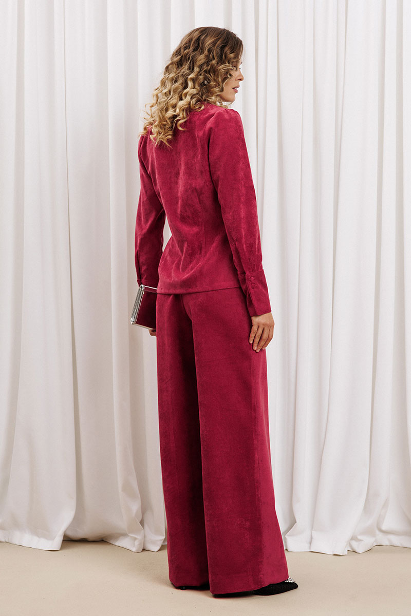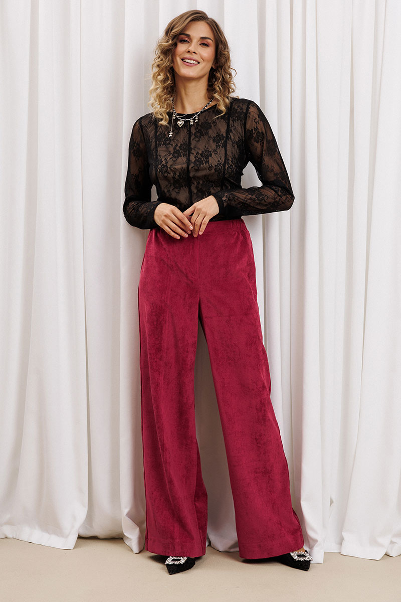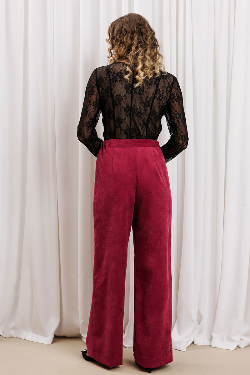 Брюки палаццо с притачным поясом из мягкой вельветовой ткани. Спереди застежка гульфик на молнии и петлей и пуговицей по поясу. По задней частям брюк вытачки. Пояс с резинкой в боковых частях. Брюки с заутюженными стрелками.