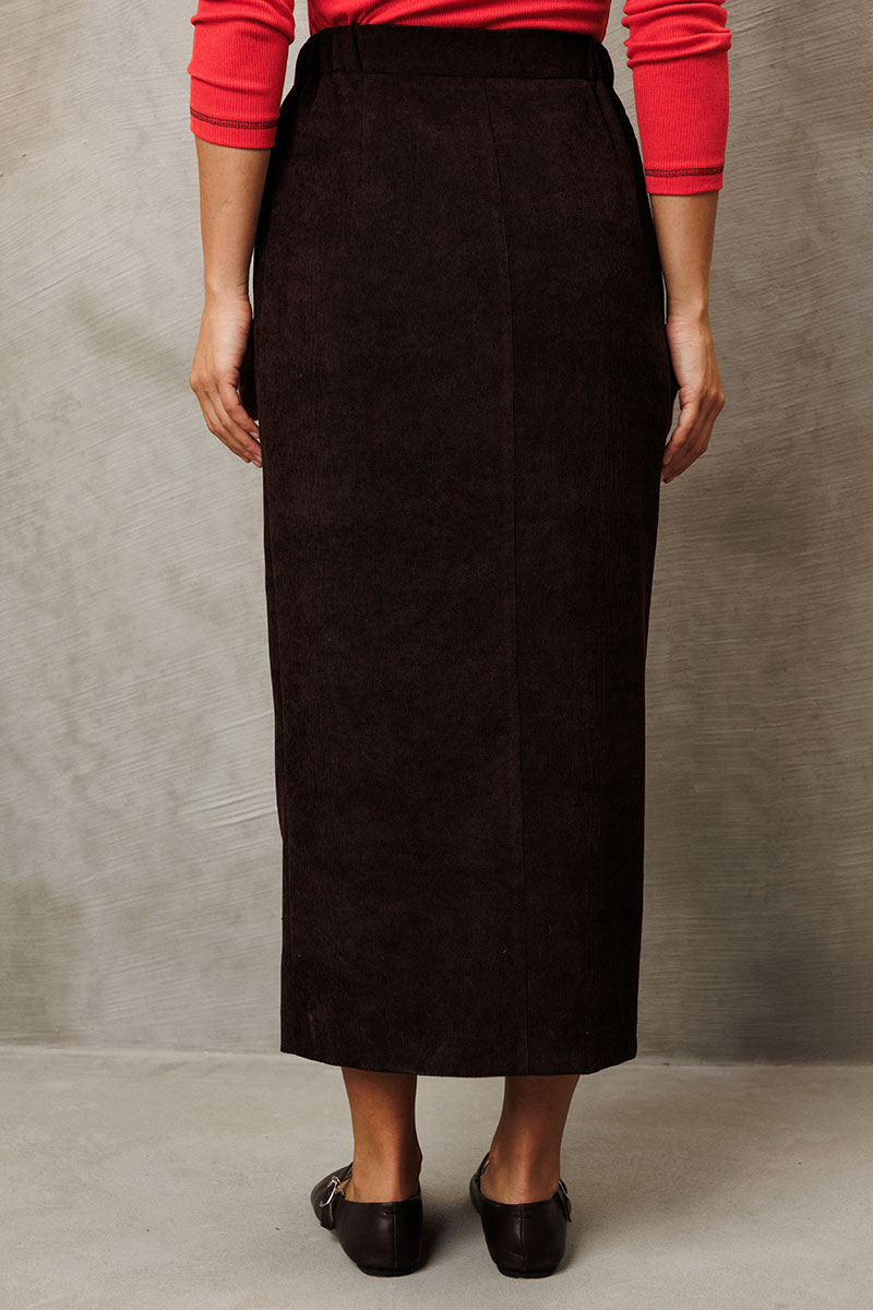 Юбка прямого силуэта выполненная из мягкой вельветовой ткани. Передняя честь юбки с вытачками, со средним швом и застежкой гульфиком на молнии и щлицей спереди. Задняя часть юбки с вытачками. Юбка на притачном поясе с затежкой на петлю и пуговицу спереди и резинками по бокам. Юбка на подкладке.