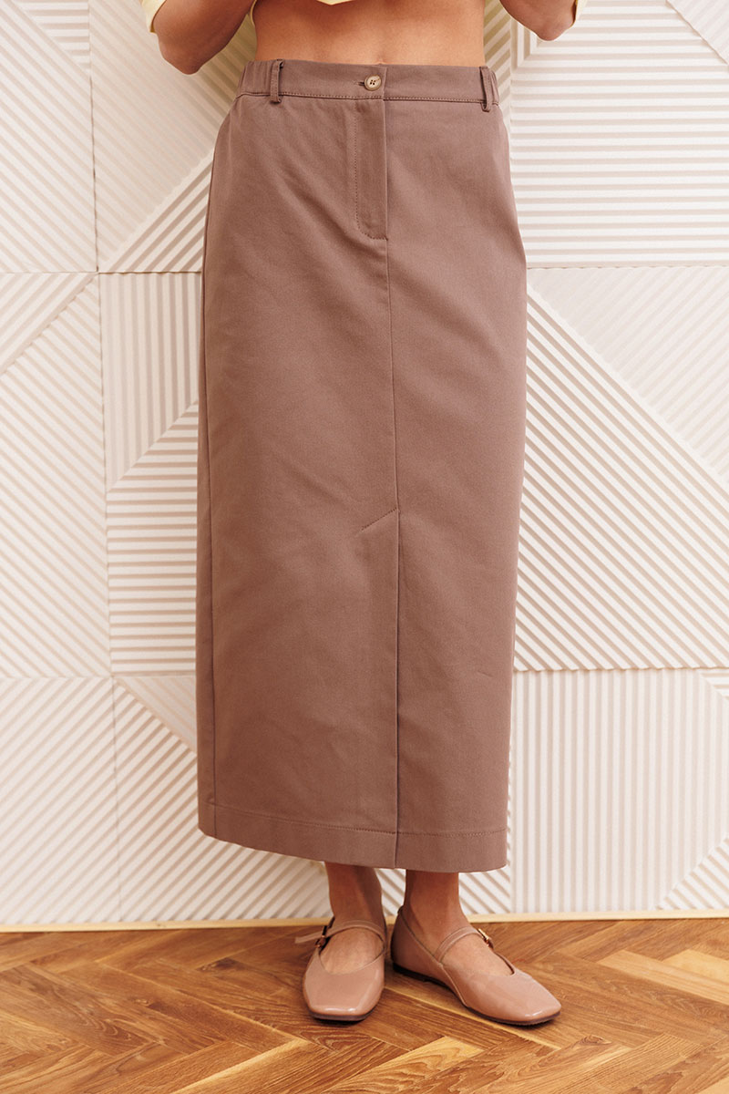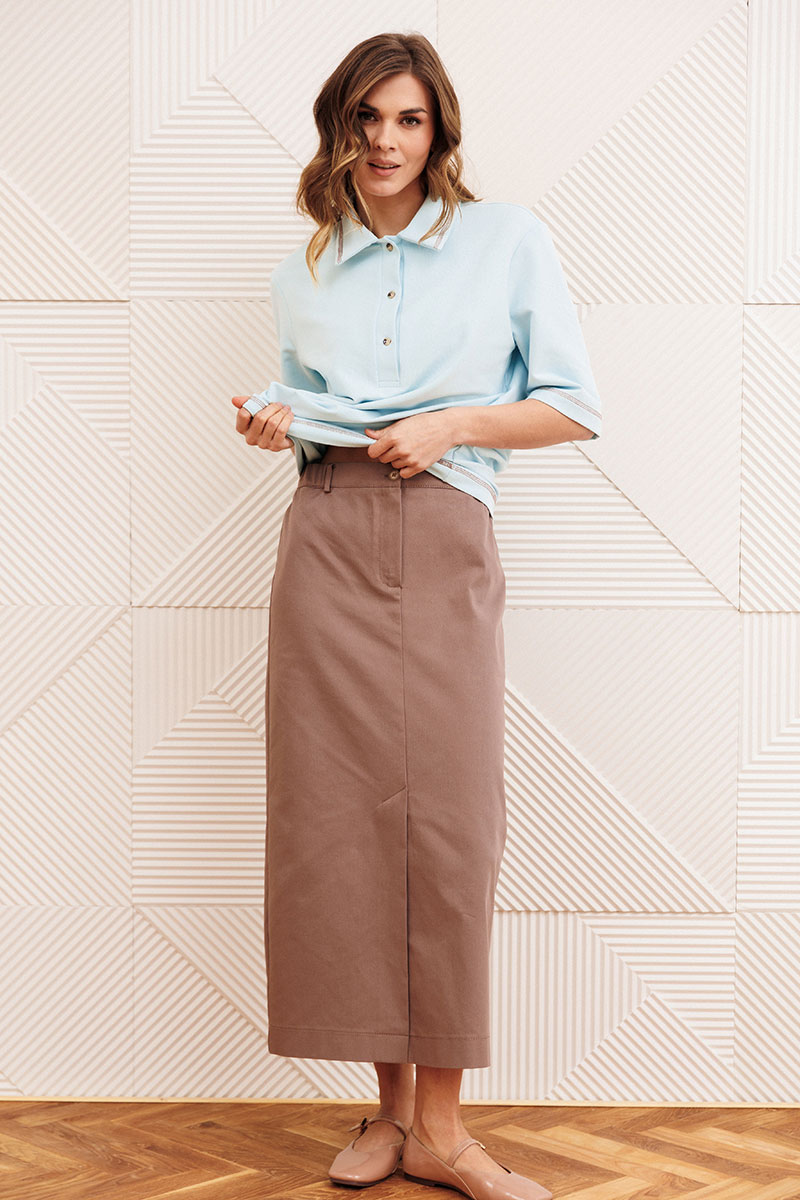 Юбка прямого силуэта выполненная из мягкой вельветовой ткани. Передняя честь юбки с вытачками, со средним швом и застежкой гульфиком на молнии и щлицей спереди. Задняя часть юбки с вытачками. Юбка на притачном поясе с затежкой на петлю и пуговицу спереди и резинками по бокам. Длина юбки с учетом пояса - 90 см.