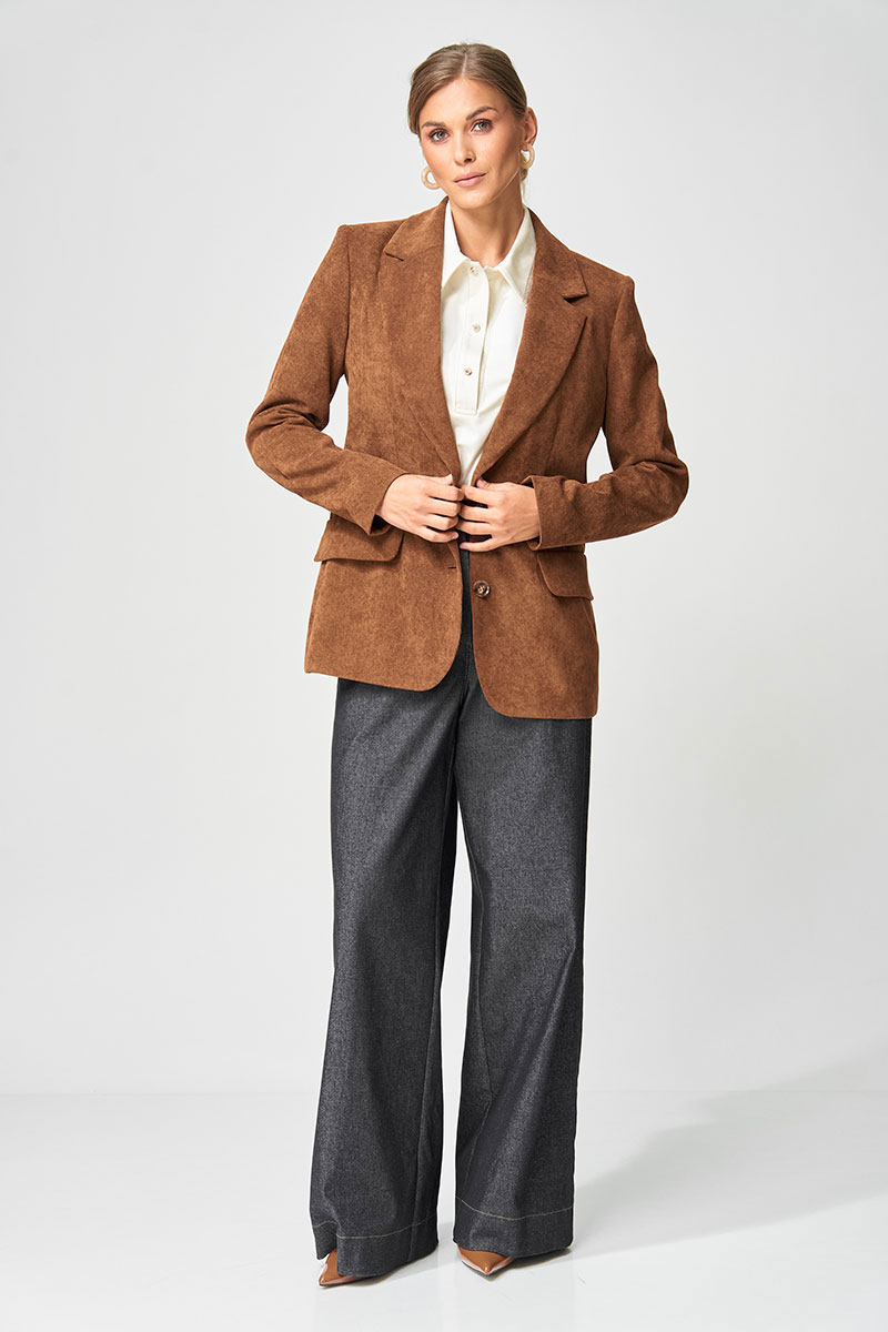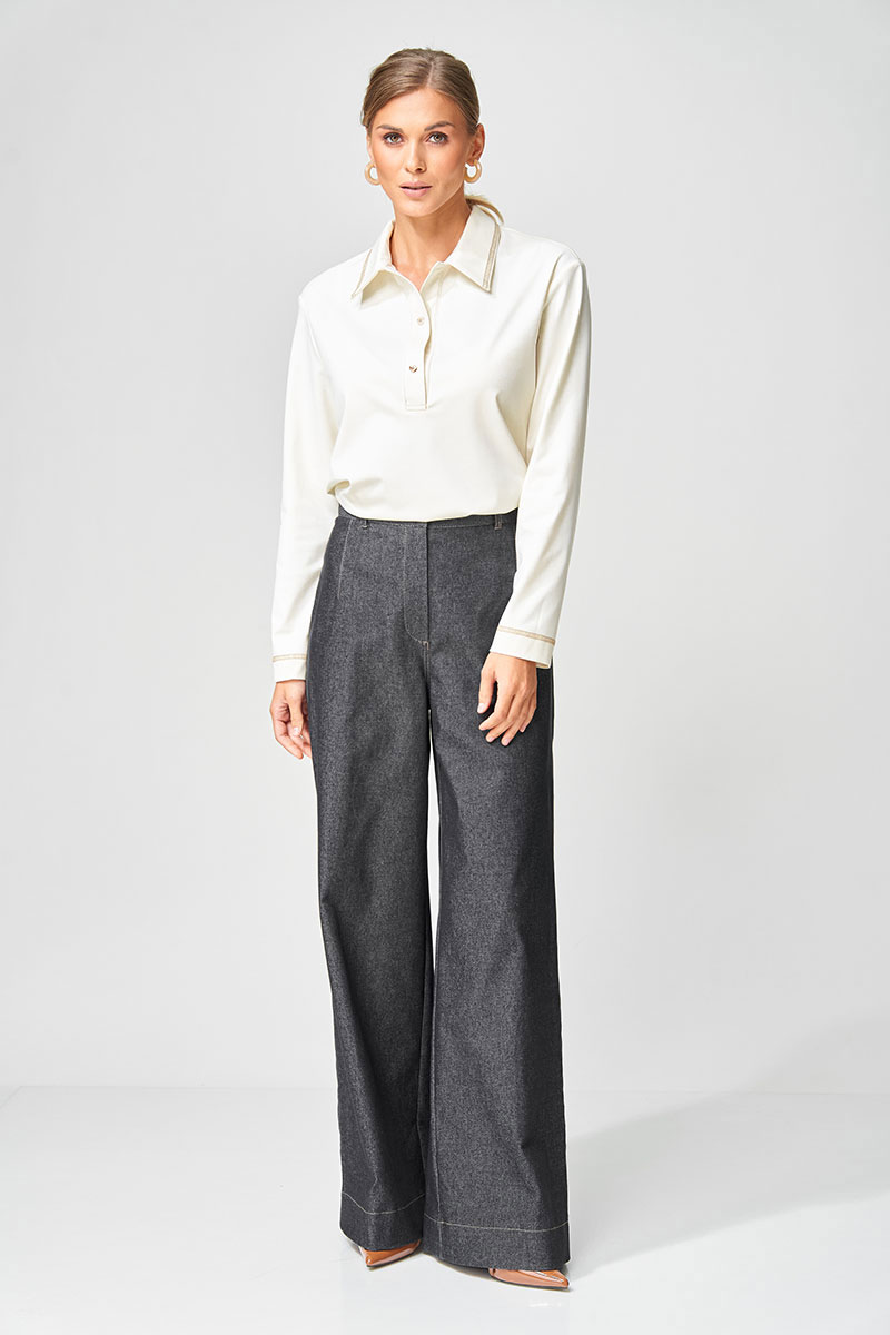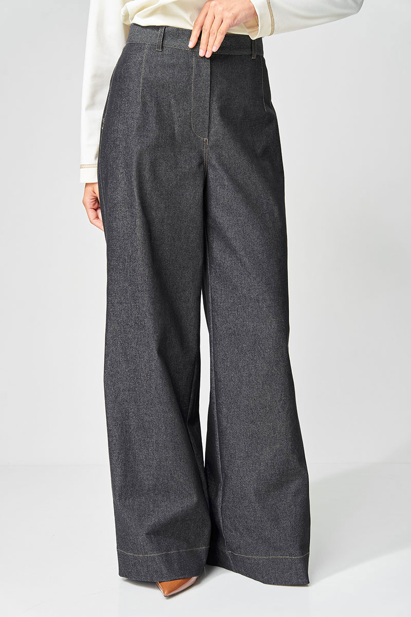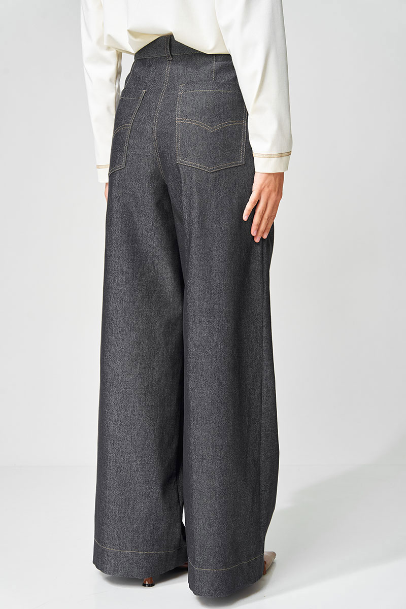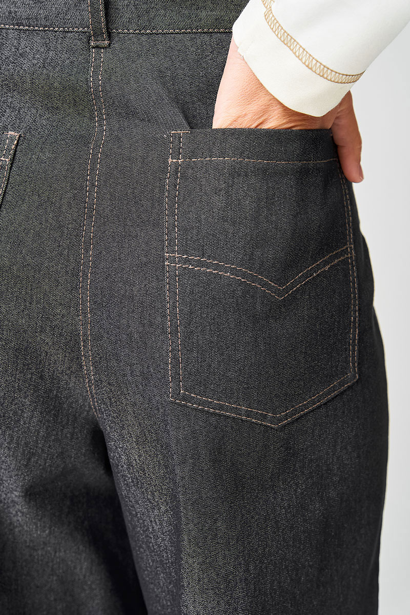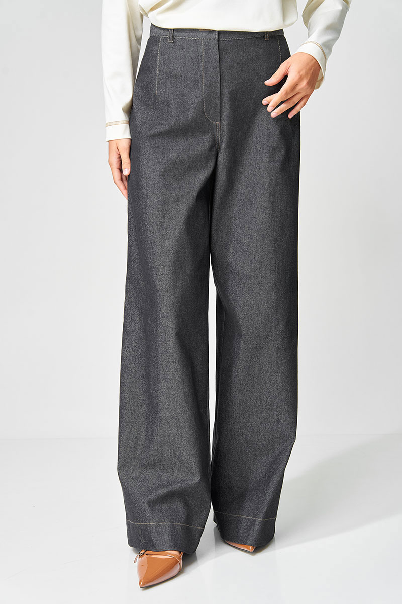 Брюки расширеные книзу на притачном поясе из джинсовой хлопковой ткани. По поясу настрочены шлевки. По передним и задним частям брюк вытачки. На задних частях брюк настрочены карманы. Карманы, вытачки, пояс, низ брюк отделаны отделочной строчкой. Данная модель прекрасно сочетается с другими моделями из нашей коллекции 15409, 15377, 15416, 15408/1. Создайте гармоничный образ, комбинируя эти изделия!
