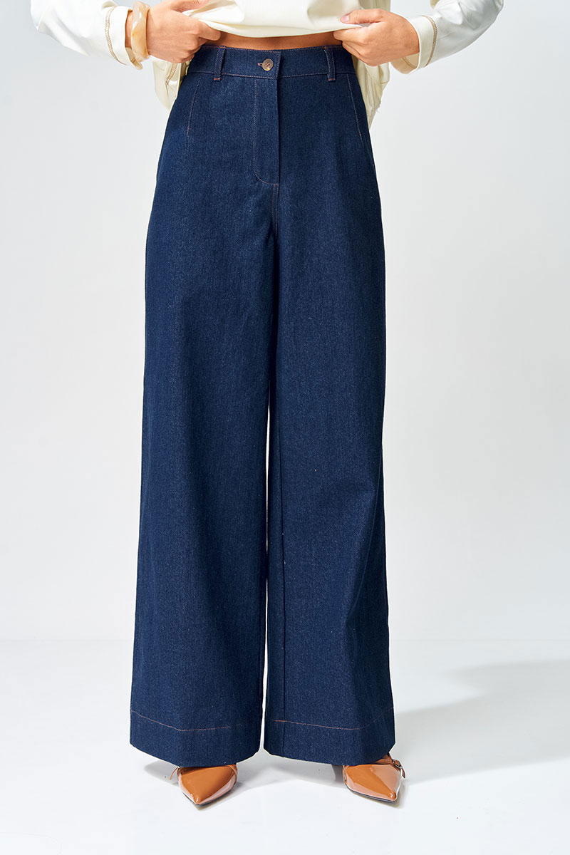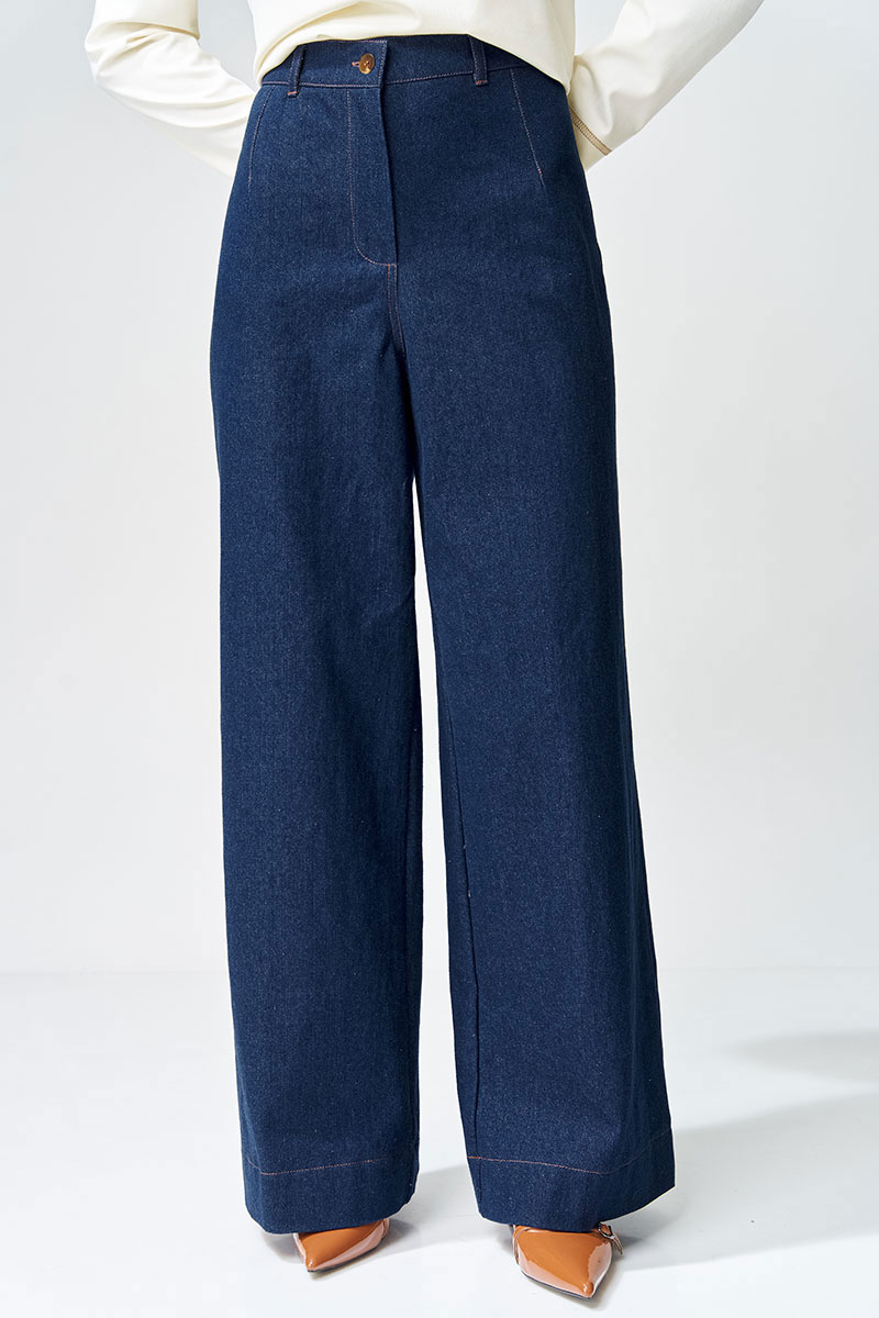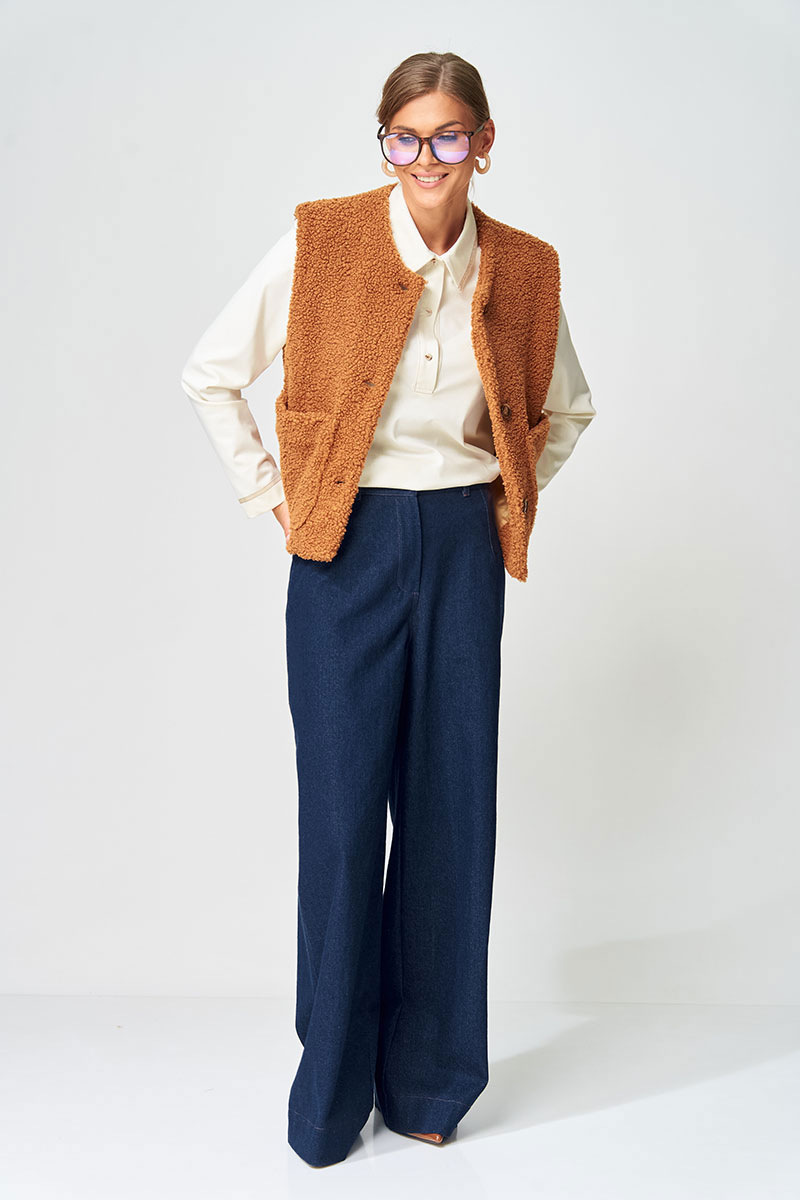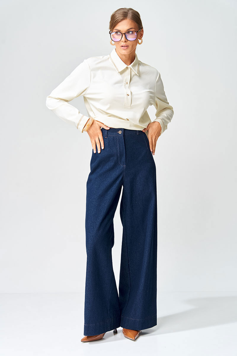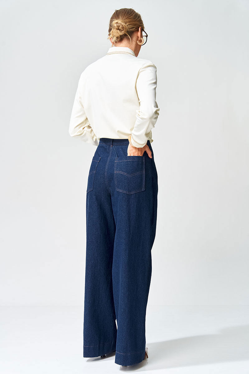 Брюки расширеные книзу на притачном поясе из джинсовой хлопковой ткани. По поясу настрочены шлевки. По передним и задним частям брюк вытачки. На задних частях брюк настрочены карманы. Карманы, вытачки, пояс, низ брюк отделаны отделочной строчкой. Данная модель прекрасно сочетается с другими моделями из нашей коллекции 15409, 15377, 15408/1, 15368. Создайте гармоничный образ, комбинируя эти изделия!