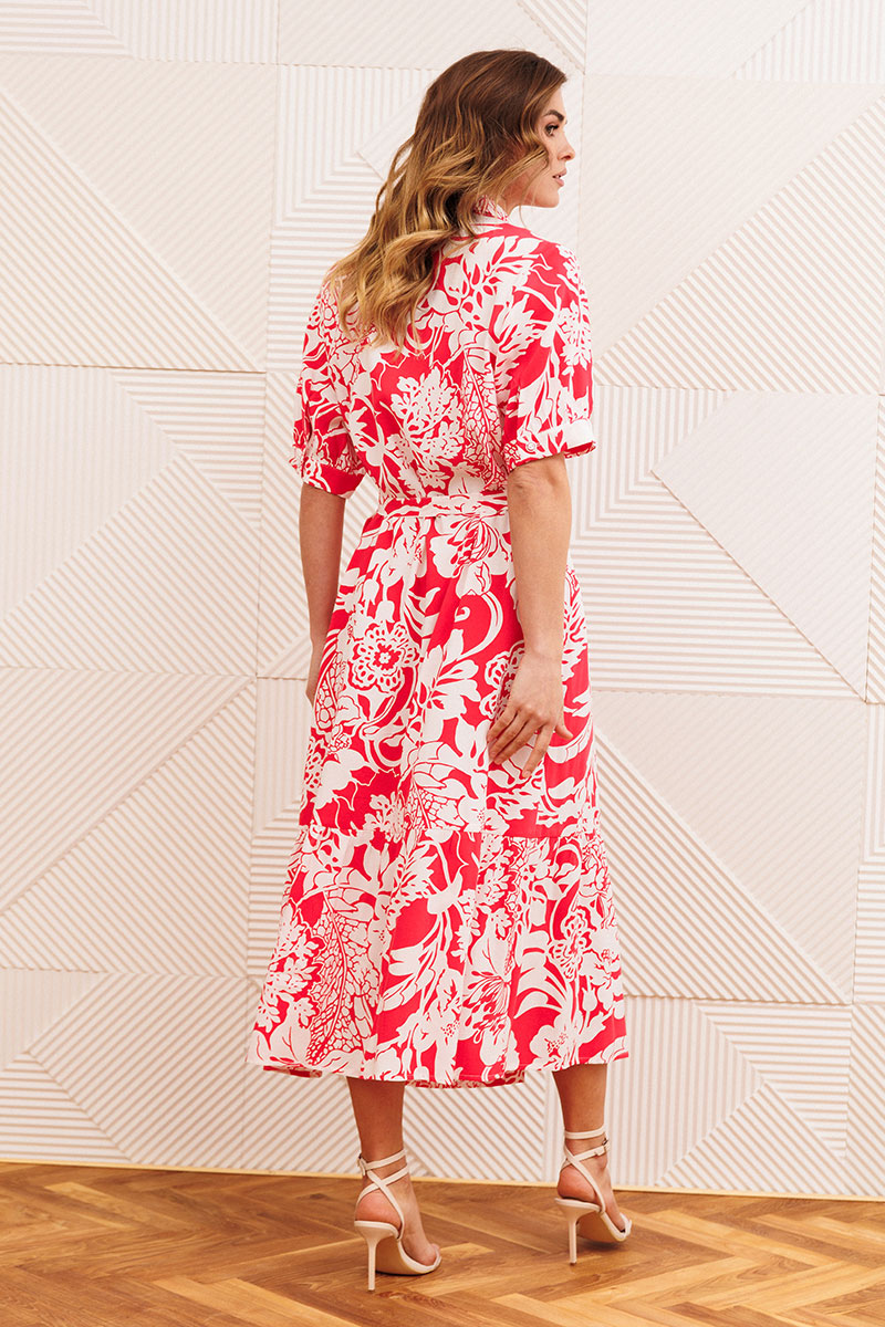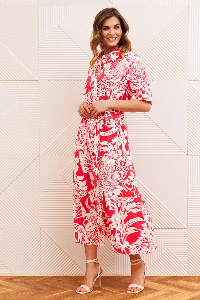 Платье А-образного силуэта выполнено из вискозной штапельной ткани. Платье с рубашечным воротником и центральной застежкой на 12 петель и пуговиц. Перед с нагрудной вытачкой. Рукав втачной одношовный с притачной манжетой на 1 петлю и пуговицу. По линии притачивания - сборка. По низу платья притачан волан со сборкой. К платью прилагается съемный пояс из основной ткани.