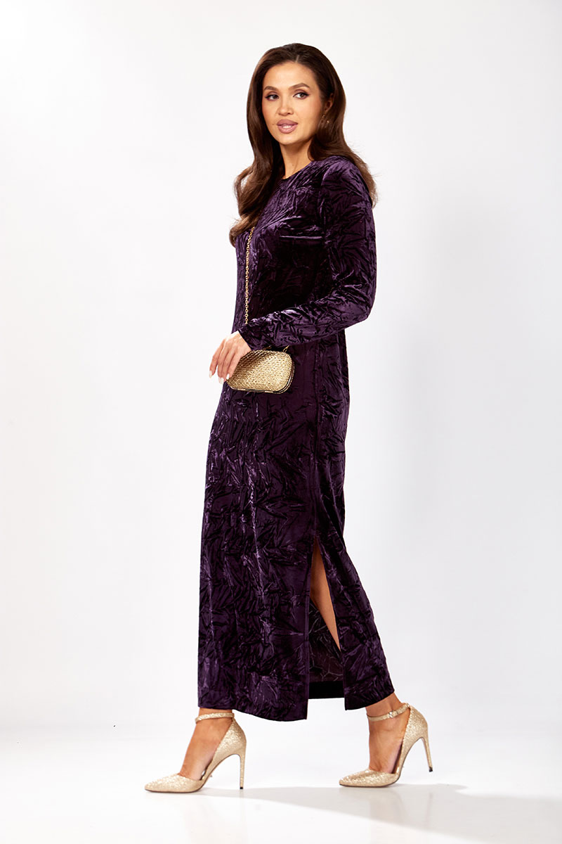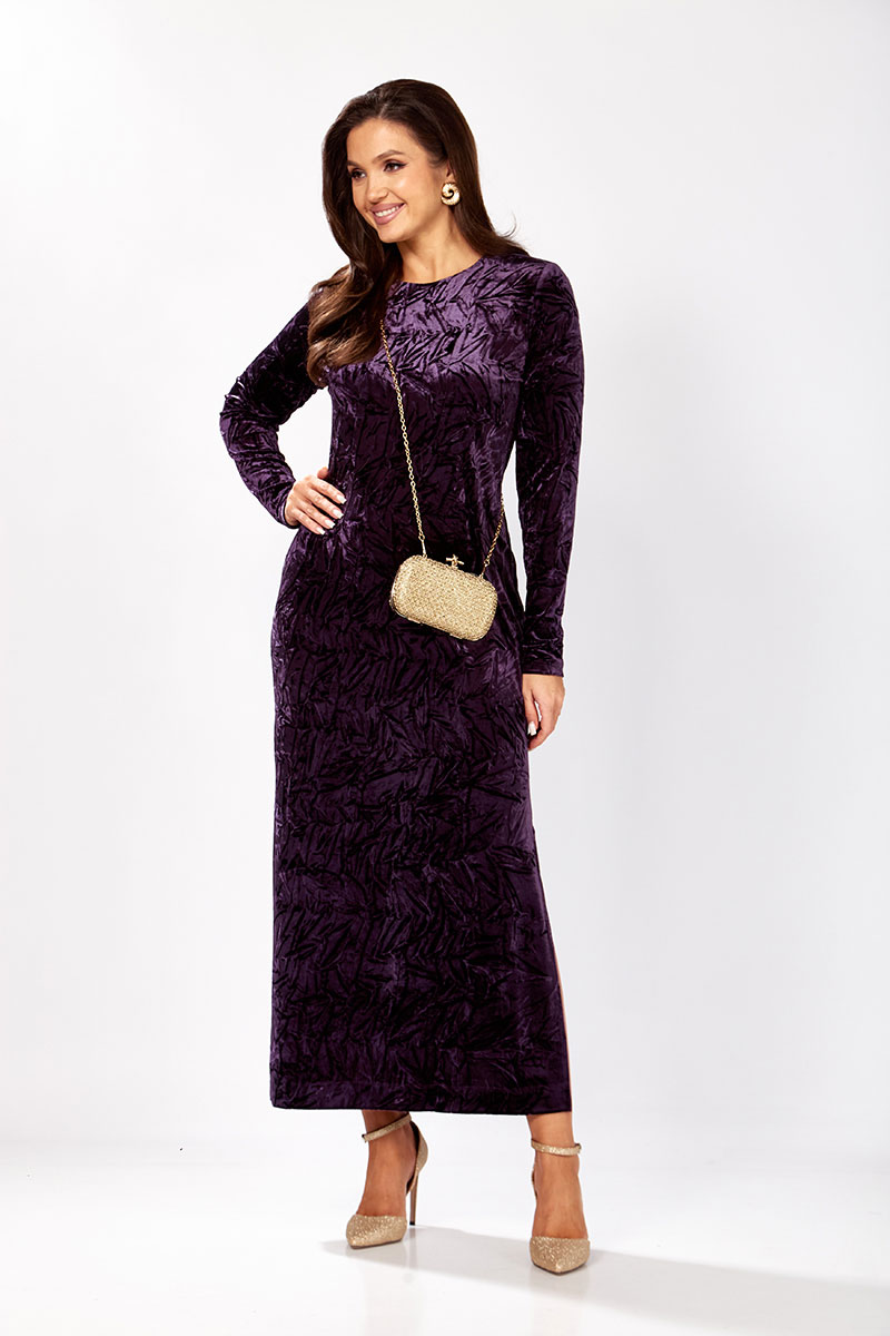 Платье прямого силуэта из бархата. В боковом шве разрез. Рукав втачной одношовный. По спинке застежка капелька на петлю и пуговицу.