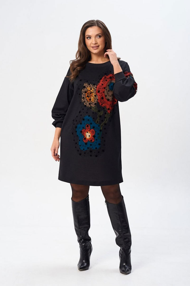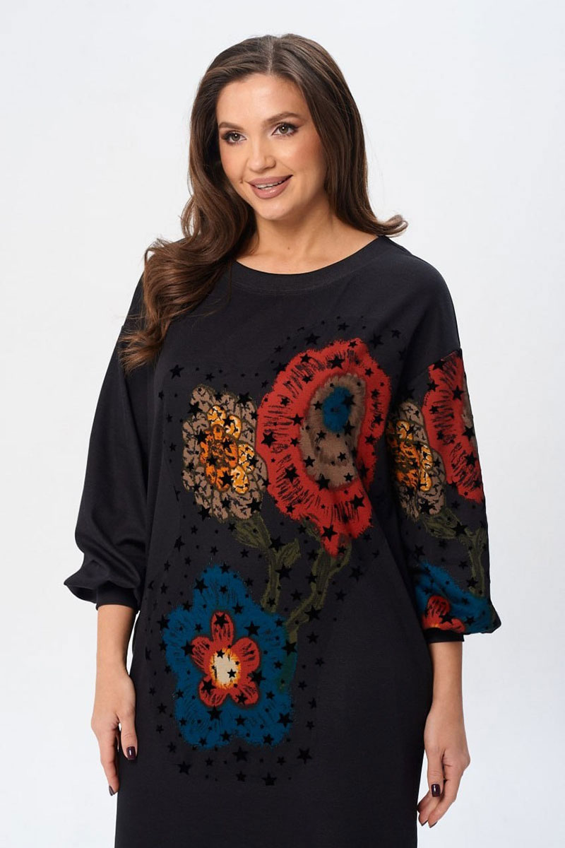 Платье свободного силуэта из трикотажной ткани с принтом. Рукав втачной одношовный со складками по низу и манжетой. В боковых швах карманы. Горловина обработана планкой в форме лодочки. По переду и по левому рукаву поверх принта настрочена сетка. Сетка может быть заменена с сохранением художественного образа изделия.