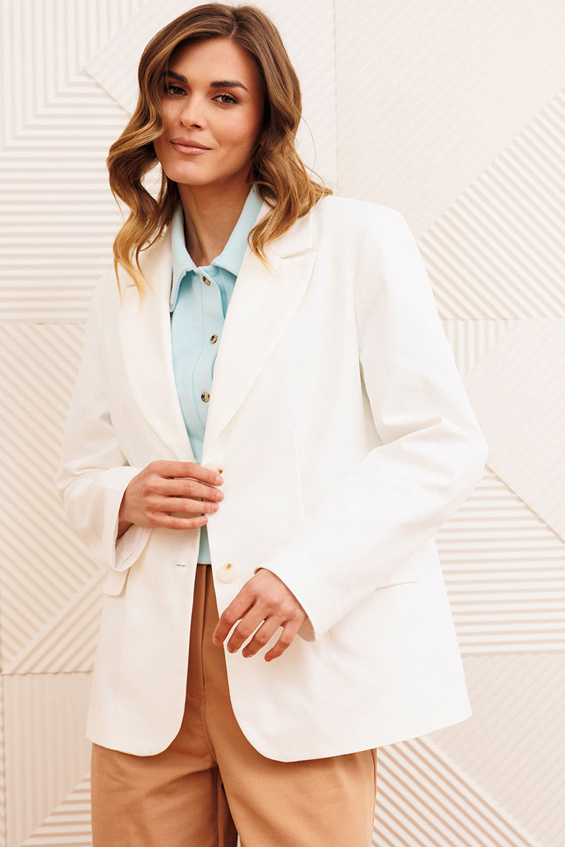 Жакет полуприлегающего силуэта с воротником пиджачного типа. Застежка однобортная на две пуговицы. Перед с талиевой вытачкой, рельефом и декоративным клапаном. Спинка с рельефами из проймы и средним швом. Рукав втачной двухшовный.