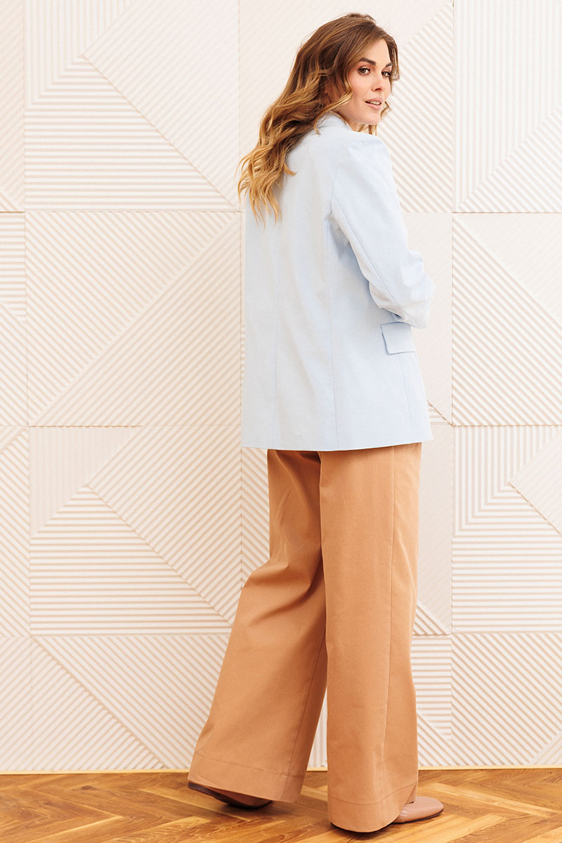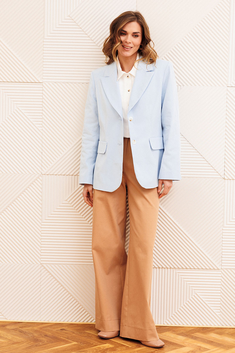 Костюм состоит из жакета и брюк из джинсовой хлопковой ткани.