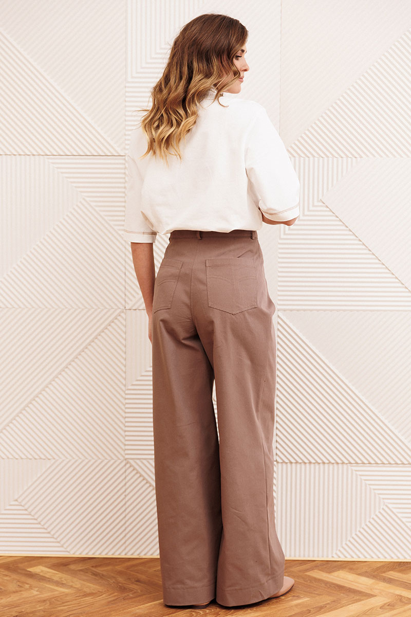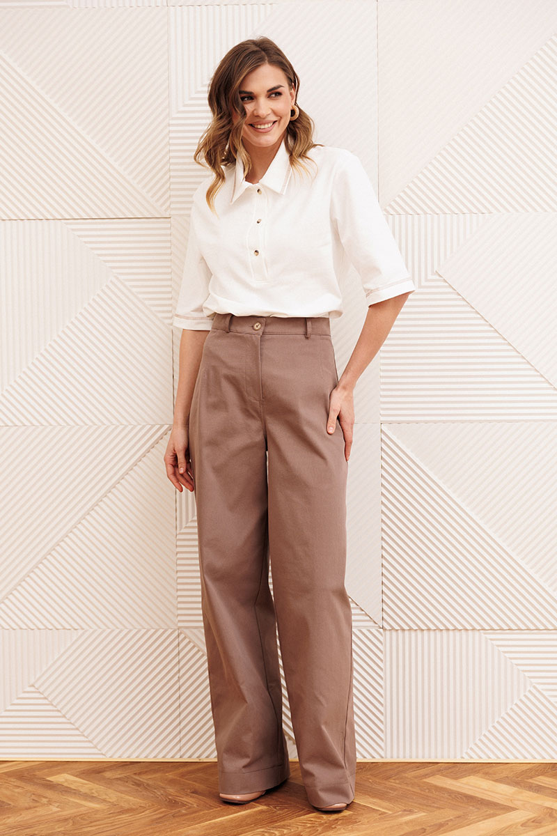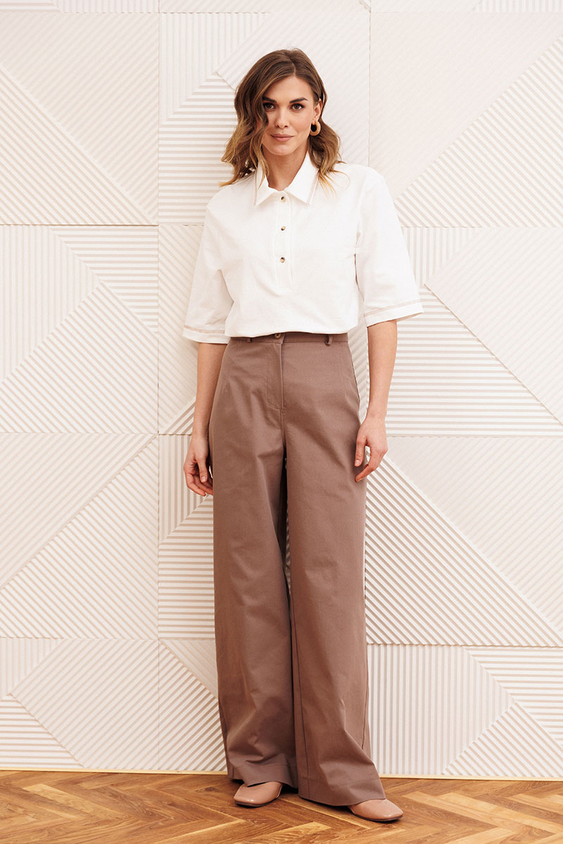 Брюки расширеные книзу на притачном поясе. По поясу настрочены шлевки. По передним и задним частям брюк вытачки. На задних частях брюк настрочены карманы. Карманы, вытачки, пояс, низ брюк отделаны отделочной строчкой.