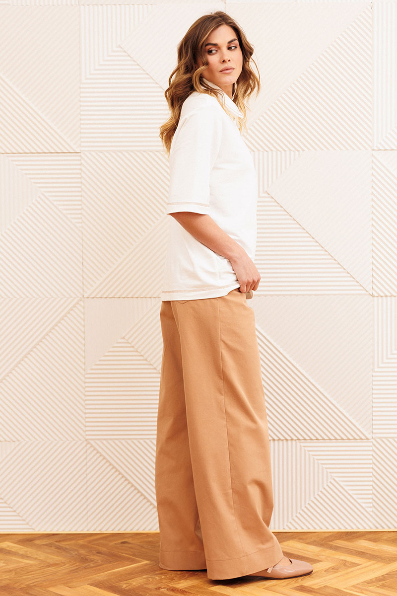 Брюки расширеные книзу на притачном поясе. По поясу настрочены шлевки. По передним и задним частям брюк вытачки. На задних частях брюк настрочены карманы. Карманы, вытачки, пояс, низ брюк отделаны отделочной строчкой.