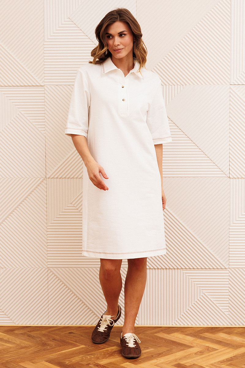 Платье прямого силуэта с воротником поло. Рукав втачной одношовный. По низу изделия, по низу рукава и по воротнику проложена отделочная строчка.