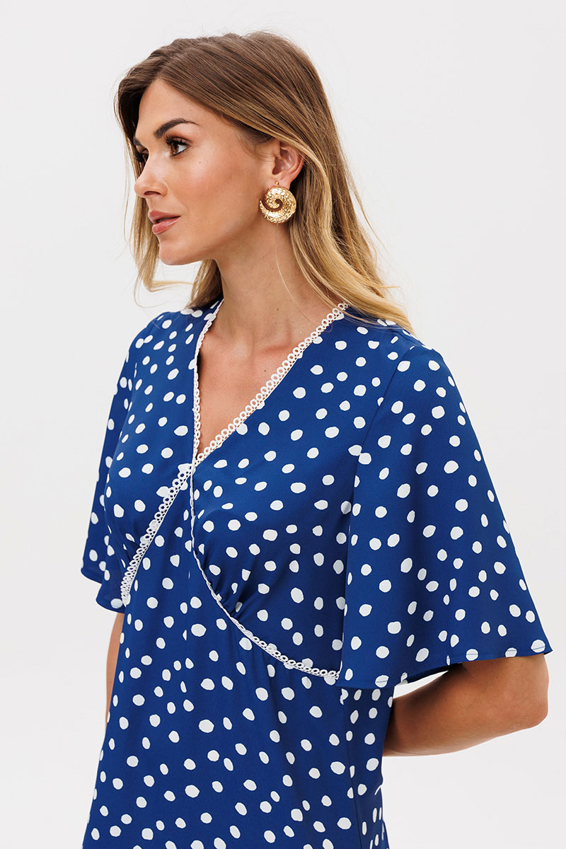 Платье А-образного силуэта выполнено из легкой ткани. Перед с V-образным вырезом и подрезами. В подрезах и вдоль горловины вставлено кружево. В районе груди в подрезах сборка. Рукав втачной расширенный книзу. Спинка со средним швом.