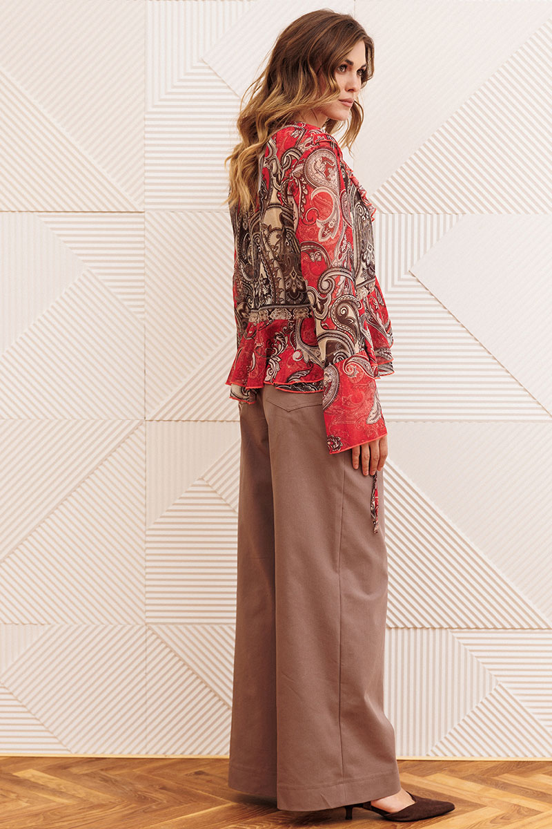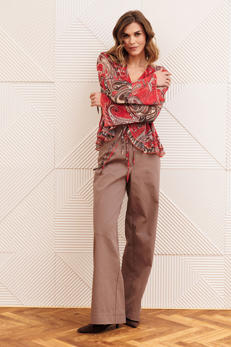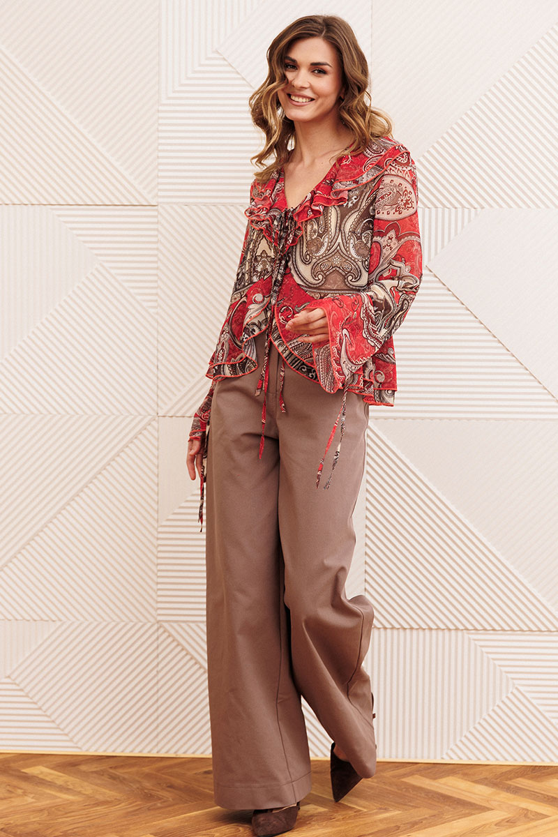 Блузка свободного силуэта в стиле бохо. Перед с нагрудными вытачками. Вдоль горловины, вдоль борта с переходом на спинку двойные рюши. Блузка спереди на завязках. Рукав втачной одношовный. Низ рукава с притачной рюшей и завязками.