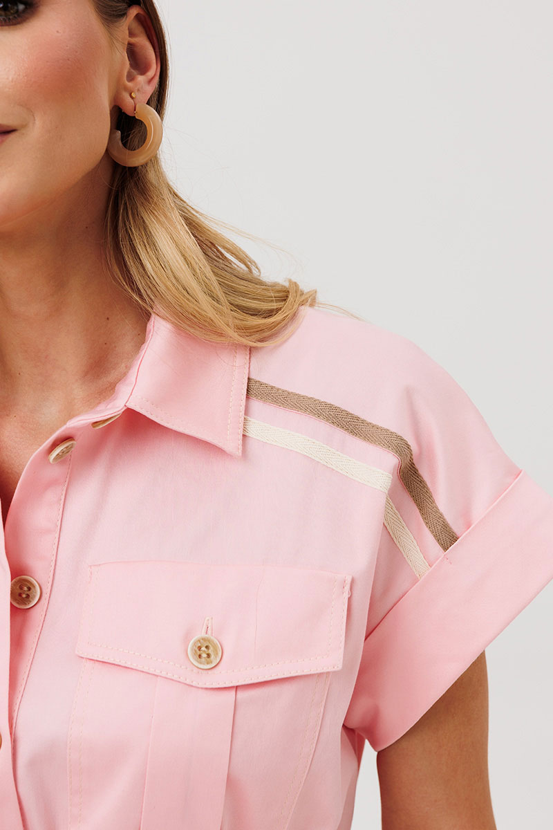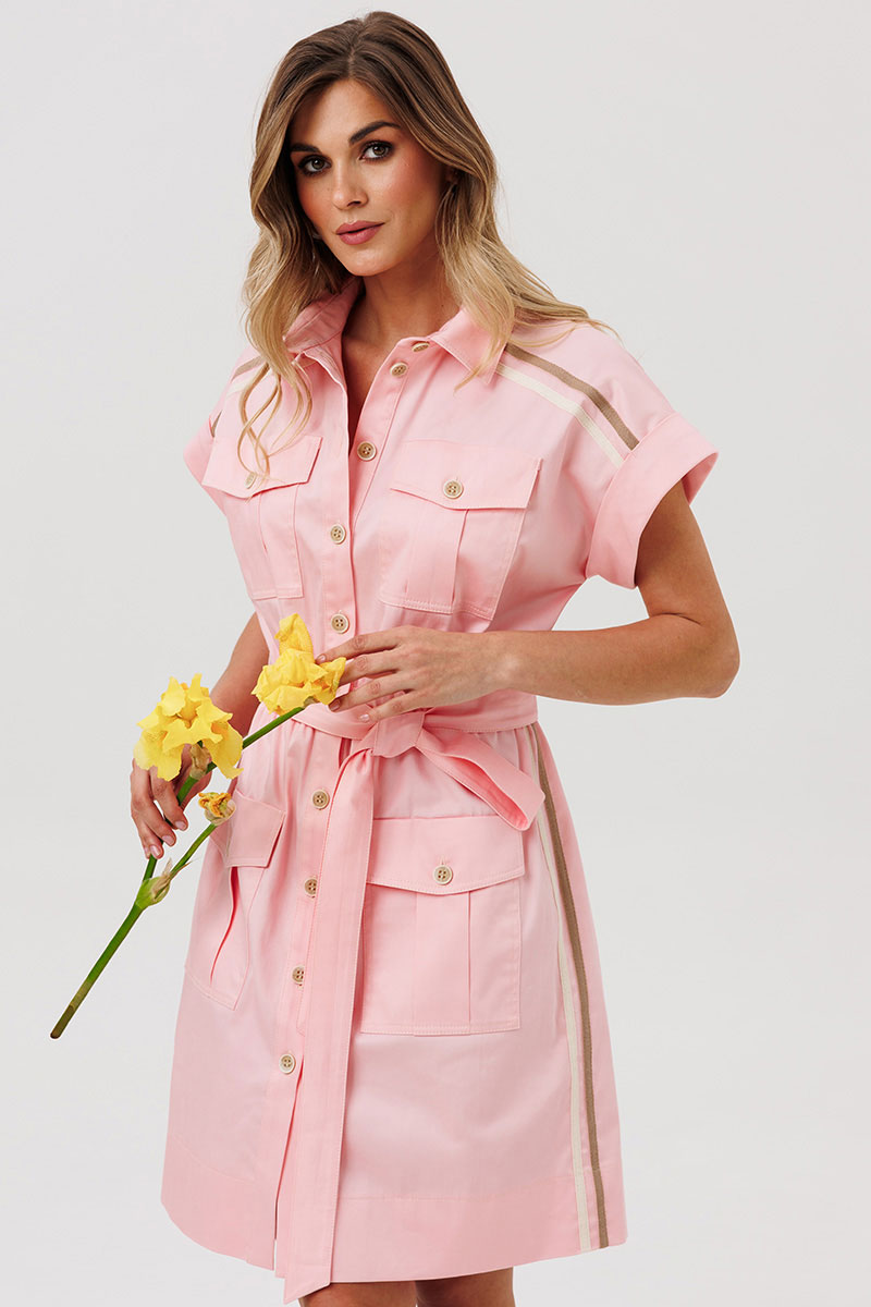 Платье в стиле сафари X-образного силуэта. Застежка центральная на петли и пуговицы с отрезной планкой. Рукав спущенное плечо с манжетой с отворотом по краю. Кокетка по переду переходящая на спинку. Спереди настрочены карманы со складкой и клапанами в районе груди и бёдер. По бокам и по краю кокетки сверху настрочена декоративная тесьма. К платью прилагается пояс из основной ткани.