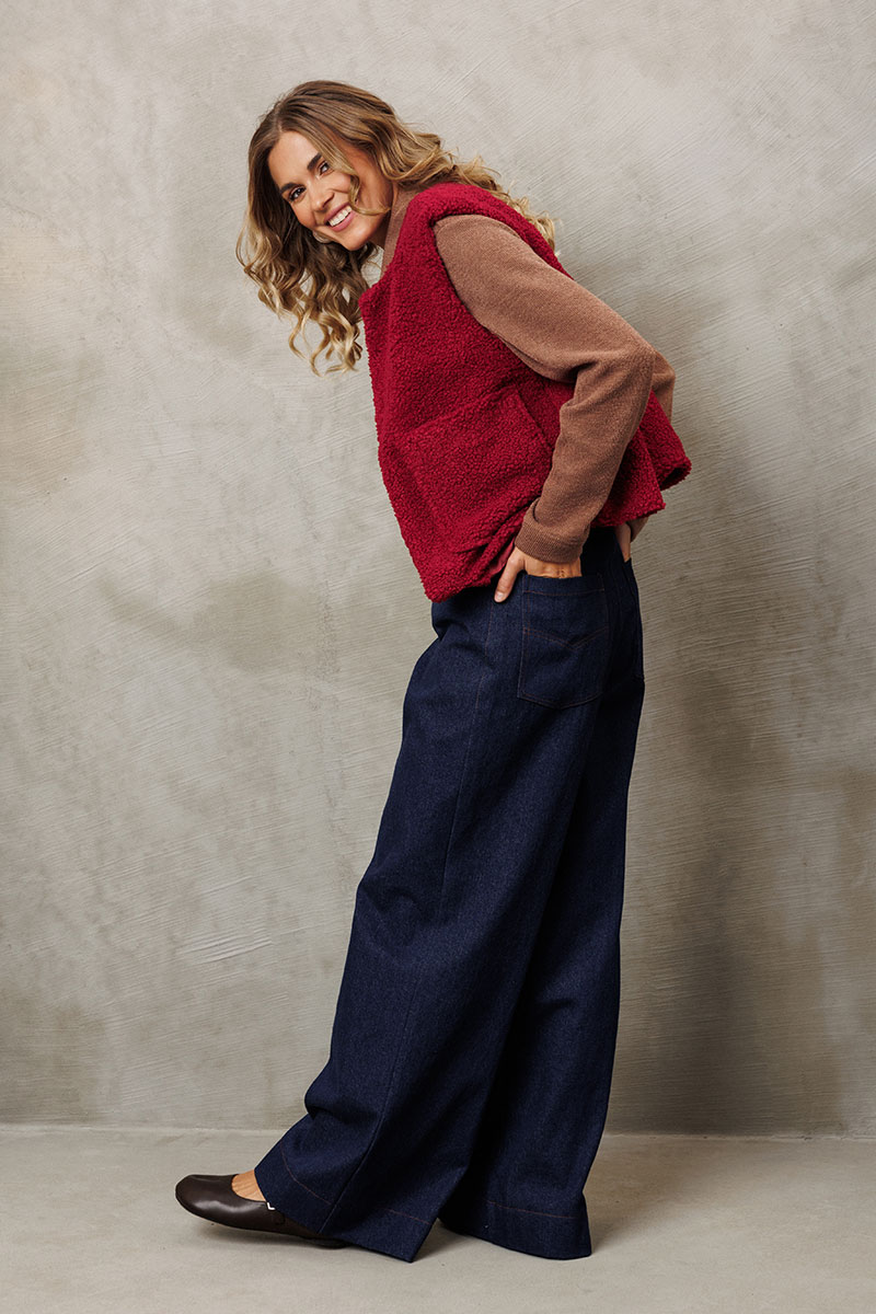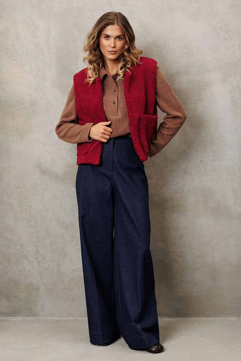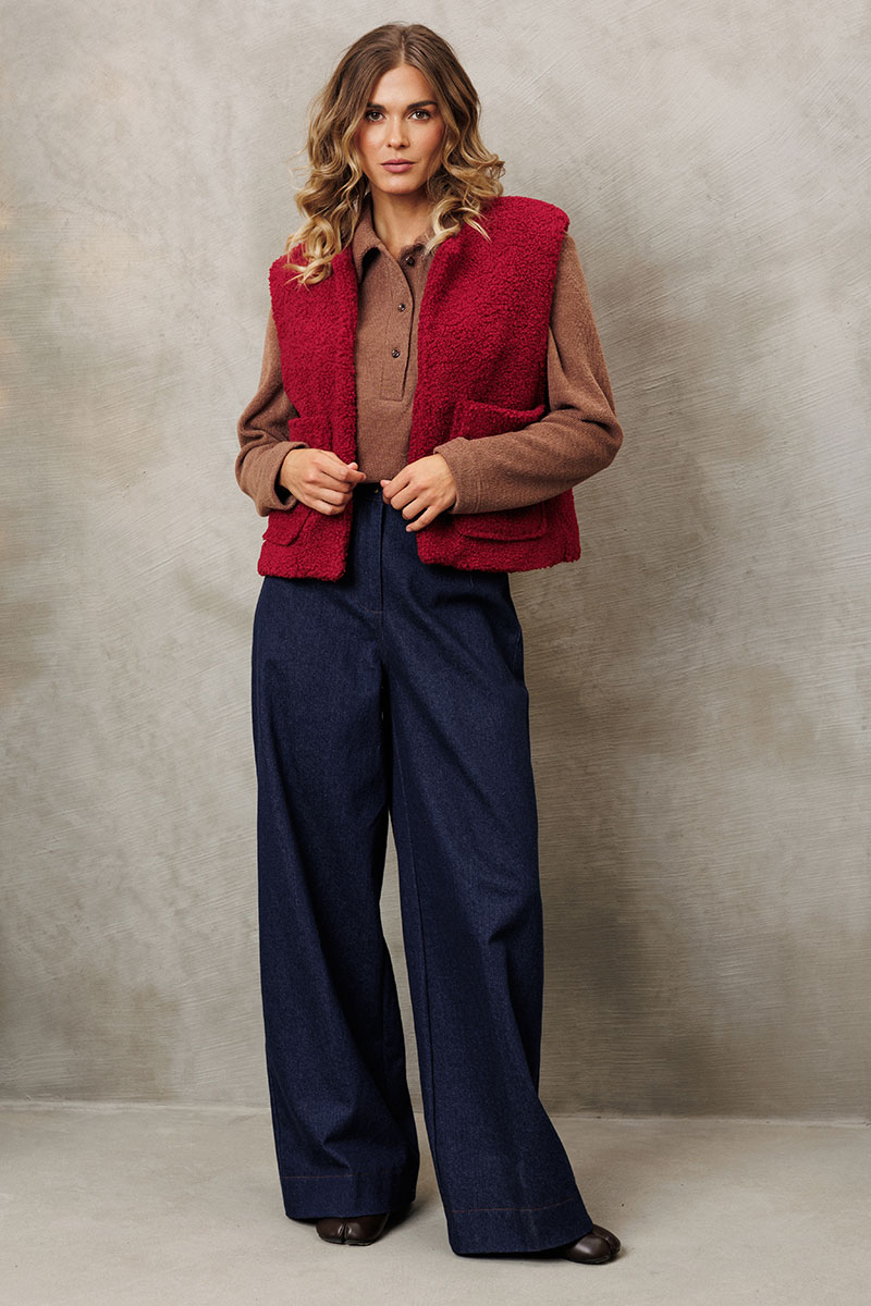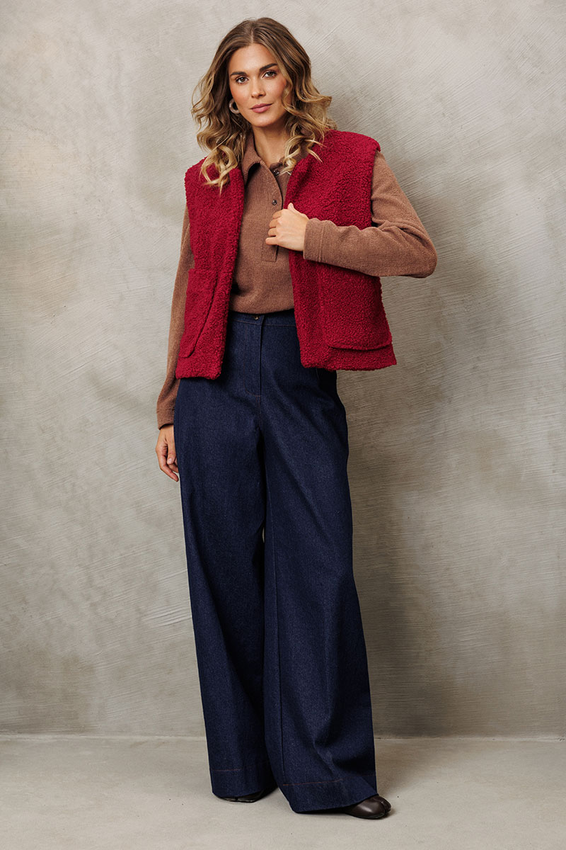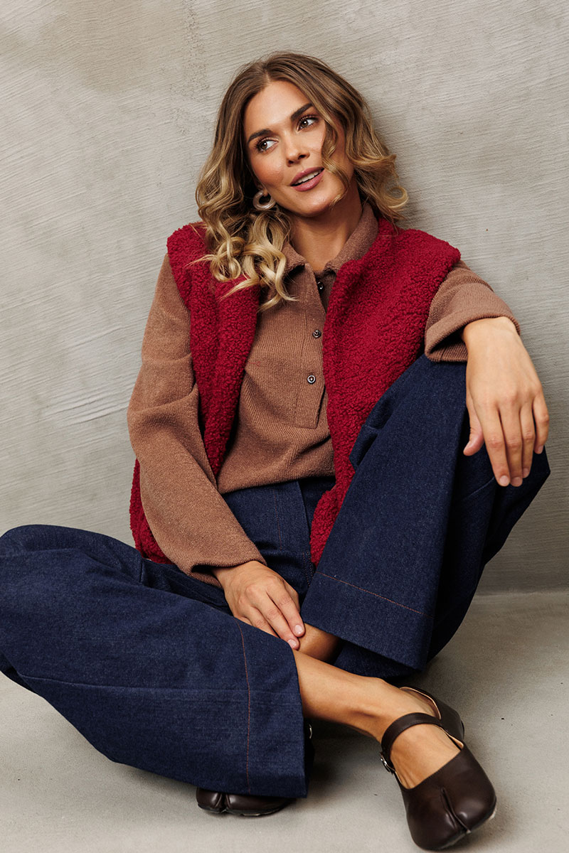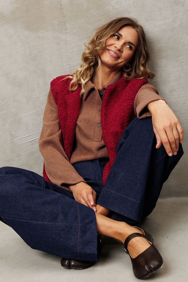 Жилет прямого свободного силуэта из теплой ткани "барашек". Перед с настрочными карманами. Застежка на 3 петли и пуговицы. Жилет на подкладке.