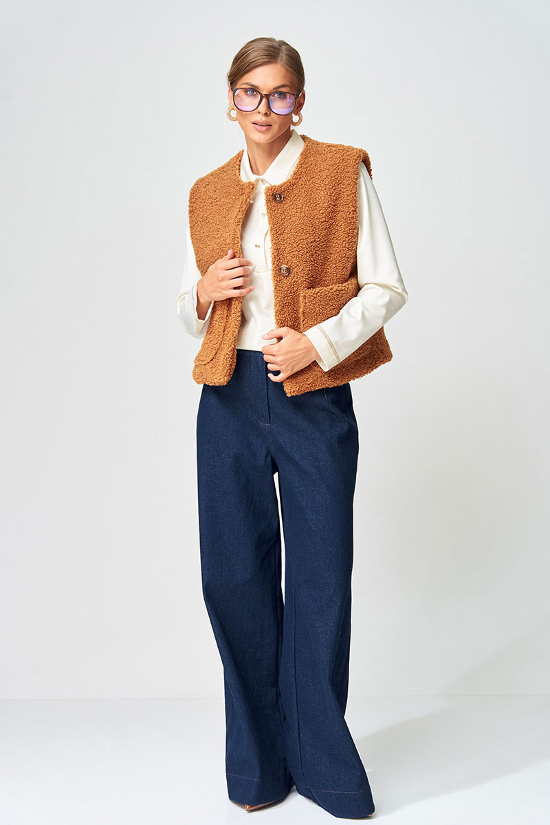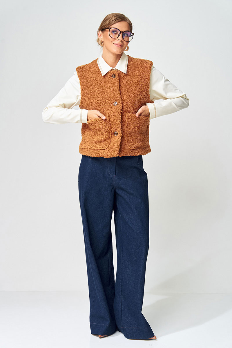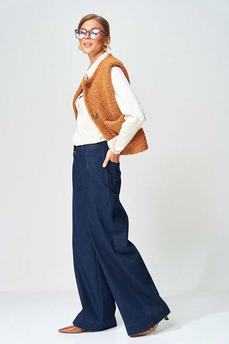 Жилет прямого свободного силуэта из теплой ткани "барашек". Перед с настрочными карманами. Застежка на 3 петли и пуговицы. Жилет на подкладке. Брюки расширеные книзу на притачном поясе из джинсовой хлопковой ткани. По поясу настрочены шлевки. По передним и задним частям брюк вытачки. На задних частях брюк настрочены карманы. Карманы, вытачки, пояс, низ брюк отделаны отделочной строчкой.
