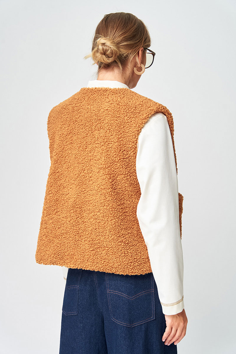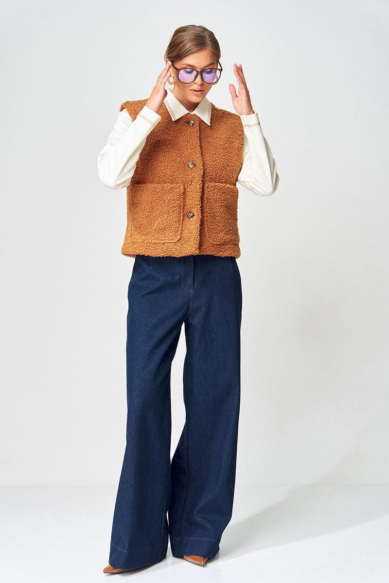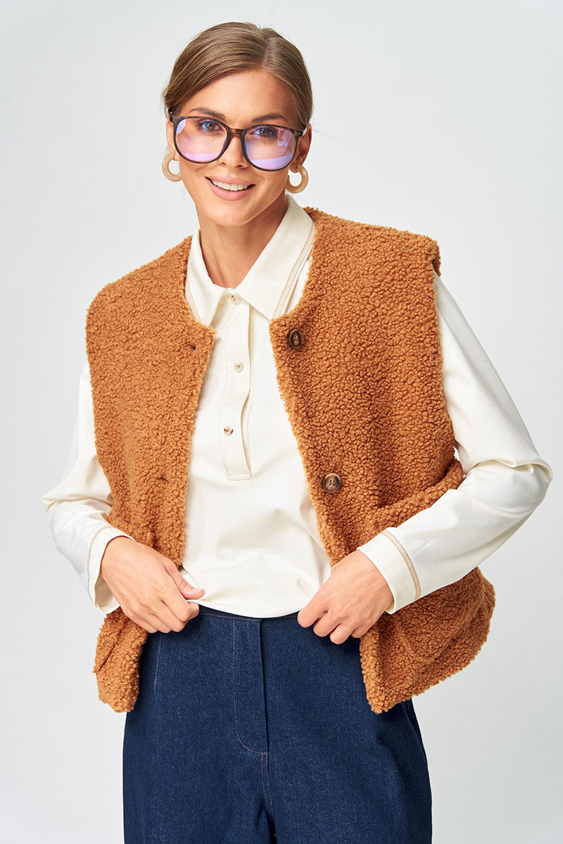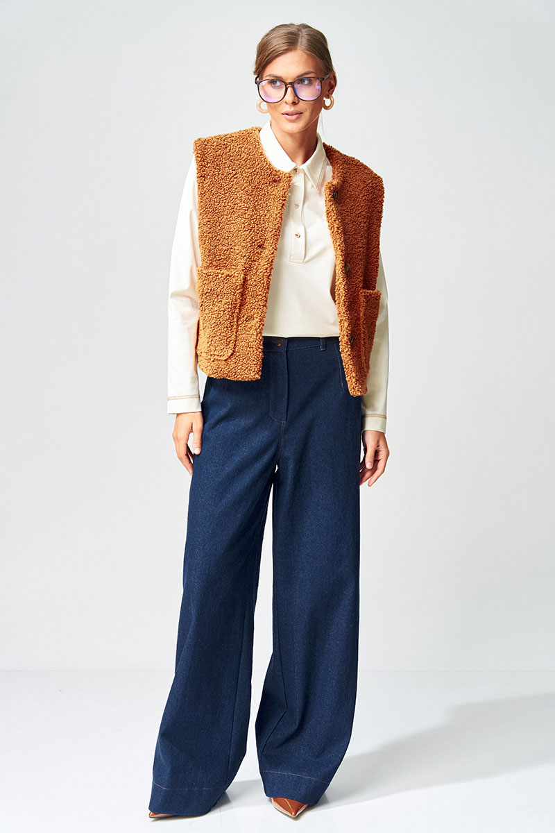 Жилет прямого свободного силуэта из теплой ткани "барашек". Перед с настрочными карманами. Застежка на 3 петли и пуговицы. Жилет на подкладке. Брюки расширеные книзу на притачном поясе из джинсовой хлопковой ткани. По поясу настрочены шлевки. По передним и задним частям брюк вытачки. На задних частях брюк настрочены карманы. Карманы, вытачки, пояс, низ брюк отделаны отделочной строчкой.