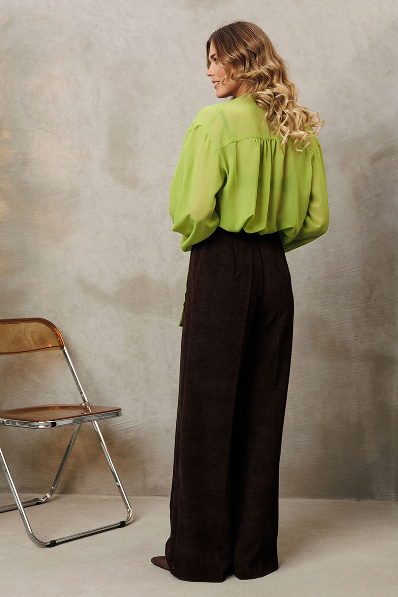 Брюки палаццо с притачным поясом из мягкой вельветовой ткани. Спереди застежка гульфик на молнии и петлей и пуговицей по поясу. По задней частям брюк вытачки. Пояс с резинкой в боковых частях. Брюки с заутюженными стрелками.