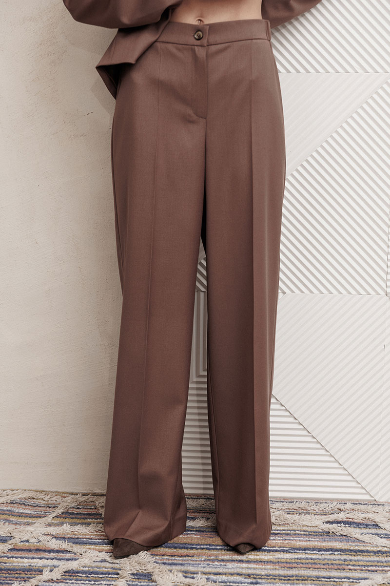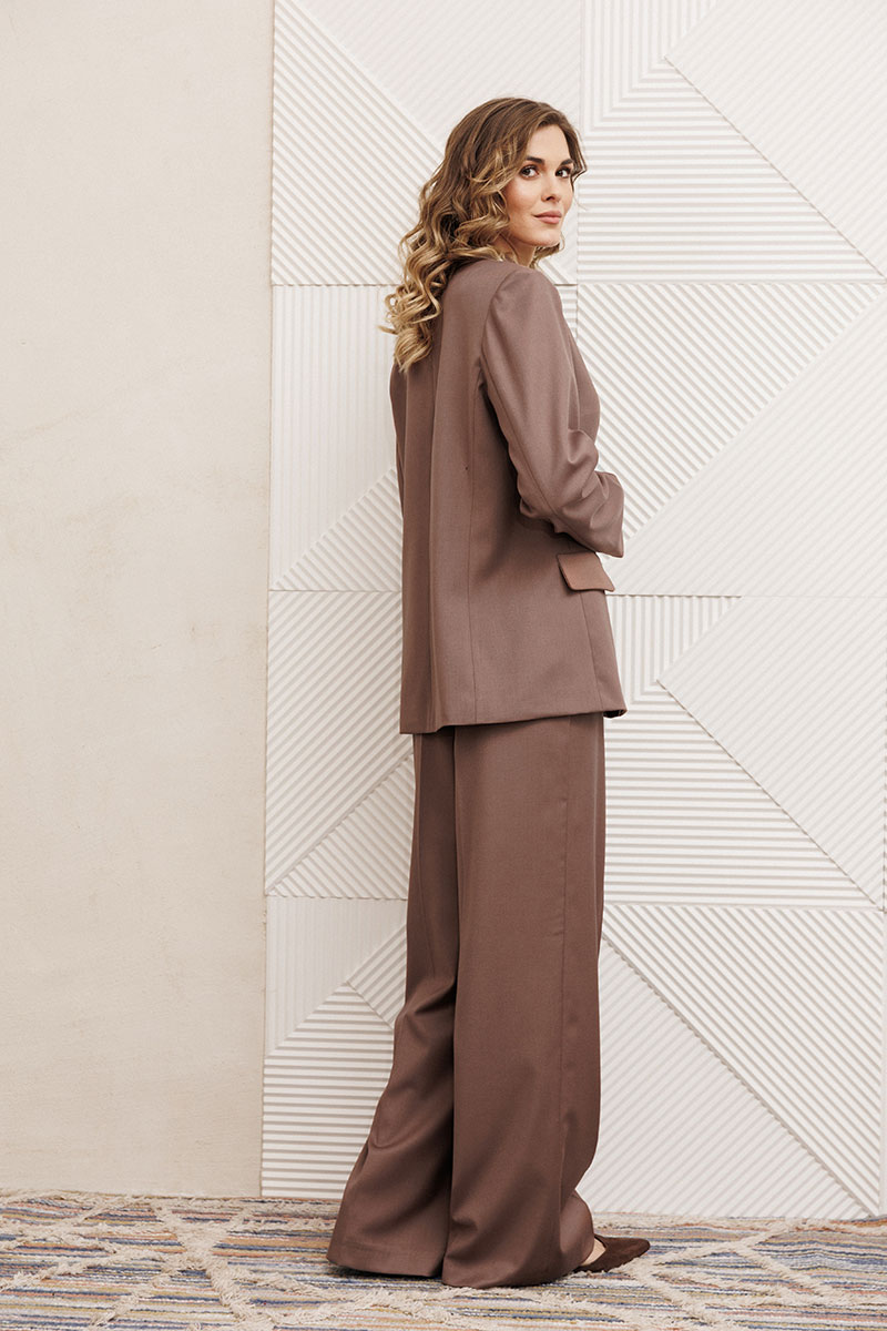 Костюм состоит из жакета и брюк из костюмной вискозной ткани цвета капучино.