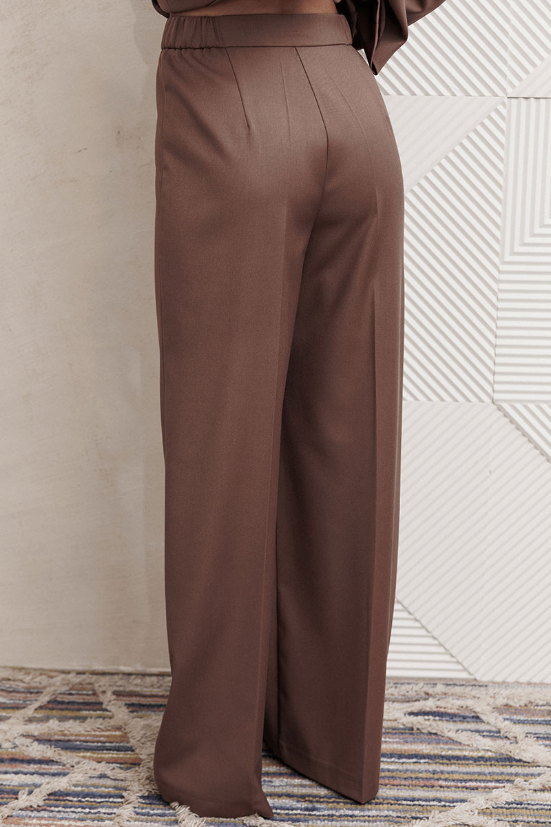 Брюки палаццо с притачным поясом. Спереди застежка гульфик на молнии и петлей и пуговицей по поясу. По задней частям брюк вытачки. Пояс с резинкой в боковых частях. Брюки с заутюженными стрелками.