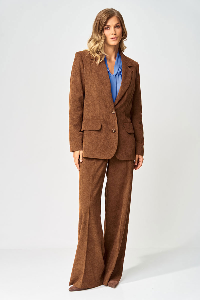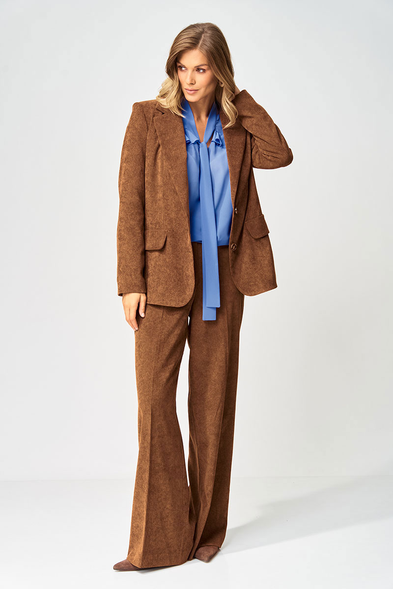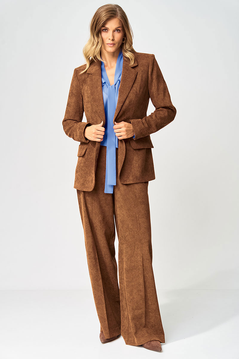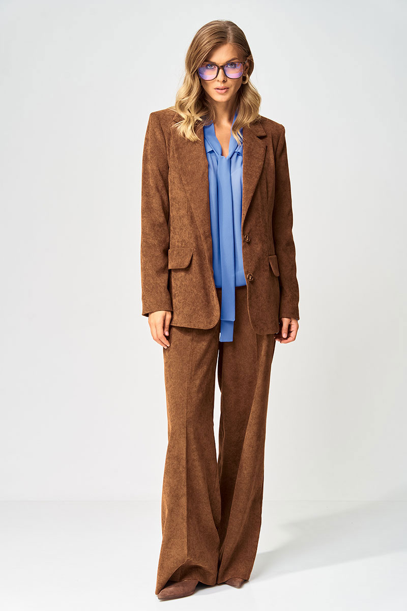 Жакет полуприлегающего силуэта из мягкой вельветовыой ткани приятного каштанового цвета. Застежка однобортная на две пуговицы, воротник пиджачного типа. Перед с талиевой вытачкой, рельефом и декоративным клапаном. Спинка с рельефами из проймы и средним швом. Рукав втачной двухшовный. Жакет на подкладке.
