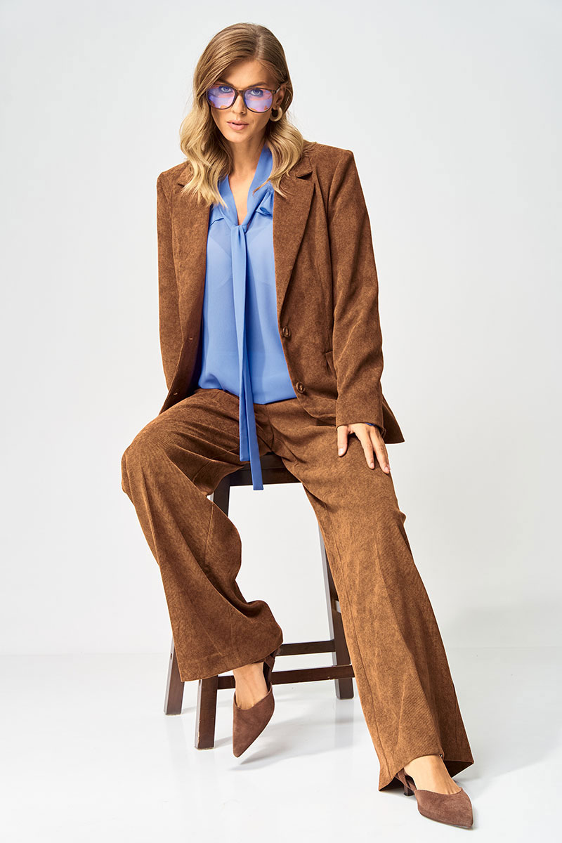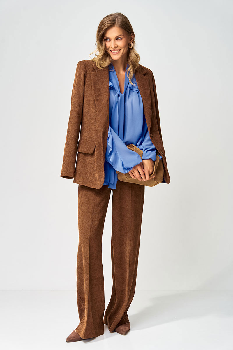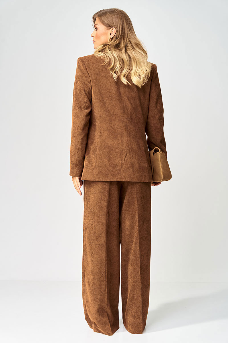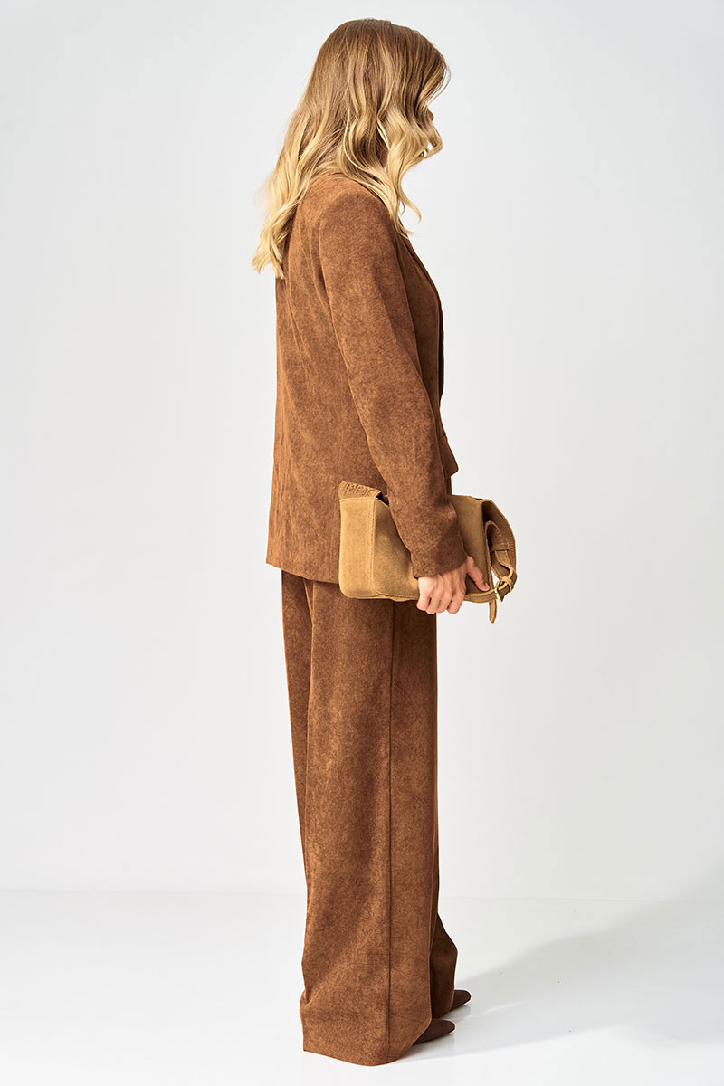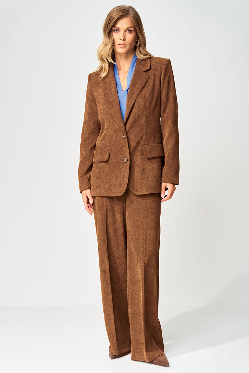 Жакет полуприлегающего силуэта из мягкой вельветовыой ткани приятного каштанового цвета. Застежка однобортная на две пуговицы, воротник пиджачного типа. Перед с талиевой вытачкой, рельефом и декоративным клапаном. Спинка с рельефами из проймы и средним швом. Рукав втачной двухшовный. Жакет на подкладке.