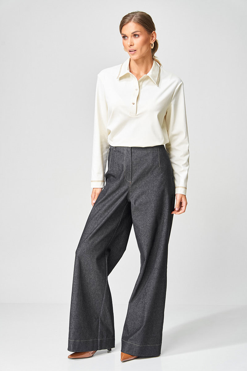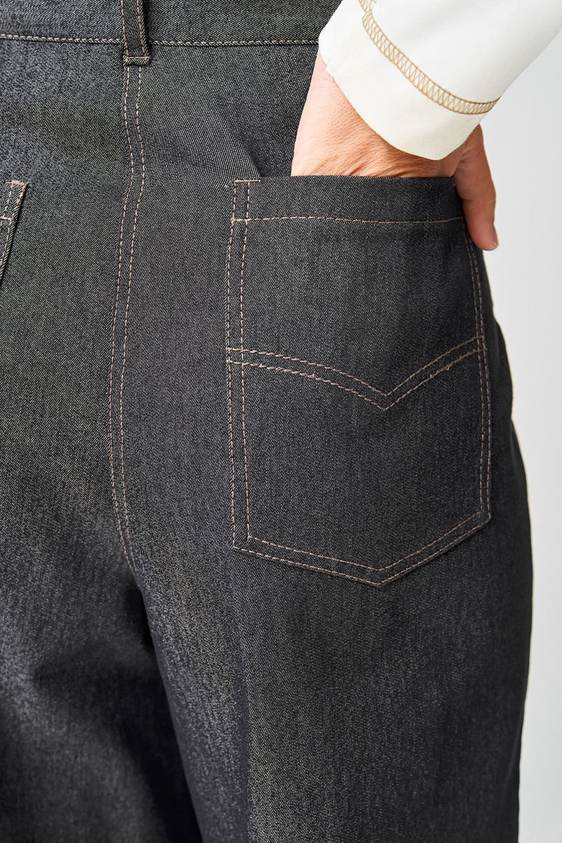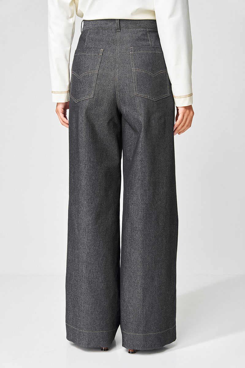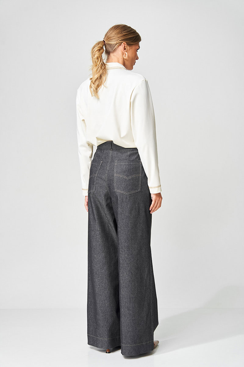Брюки расширеные книзу на притачном поясе из джинсовой хлопковой ткани. По поясу настрочены шлевки. По передним и задним частям брюк вытачки. На задних частях брюк настрочены карманы. Карманы, вытачки, пояс, низ брюк отделаны отделочной строчкой.
