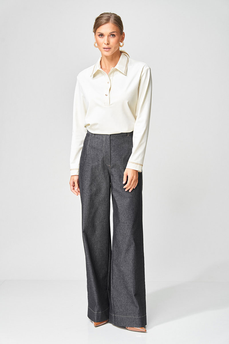 Джемпер прямого силуэта с воротником поло из плотной хлопковой ткани "двухнитка". Рукав втачной одношовный. По низу изделия, по низу рукава и по воротнику проложена отделочная строчка.